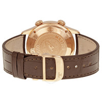 18kt rose gold case with a brown leather strap. Fixed 18kt rose gold bezel. Silver dial with rose gold alpha-style shape hands and index hour markers. Arabic numerals mark the 6, 9 and 12 o'clock positions. minute markers around the outer rim. Dial Type: Analog. Date display at the 3 o'clock position. Jaeger LeCoultre Calibre JLC 956 Automatic movement, containing 23 Jewels, composed of 268 parts, bitting at 28800 vph, and has a power reserve of approximately 45 hours. Scratch resistant sapphire crystal. Pull / push crown. Solid case back. Round case shape, case size: 40 mm, case thickness: 14 mm. Band width: 22 mm, band length: 8 inches. Deployment clasp. Water resistant at 50 meters / 165 feet. Functions: alarm, date, hour, minute, second, repeater. Master Memovox Series. Luxury watch style. Watch label: Swiss Made. Item Variations: Q1412430, 1412430, 141.24.30, Q141.24.30. Jaeger LeCoultre Master Memovox Silver Dial 18kt Rose Gold Brown Leather Men's Watch Q1412430. GENERAL Color: Brown / Gold / Rose / Silver CASE Case Size: 40 Case Thickness: 14 mm Case Material: 18kt Rose Gold Case Shape: Round Case Back: Solid BAND Band Material: Leather Band Type: Strap Band Color: Brown Band Length: 8 inches Band Width: 22 mm Clasp: Deployment DIAL Dial Color: Silver Type: Analog Crystal: Scratch Resistant Sapphire Hands: Rose Gold Alpha-style shape Dial Markers: Index Second Markers: Arabic Numerals mark the 6, 9 and 12 o'clock positions. Minute Markers around the outer rim Bezel: Fixed Bezel Material: 18kt Rose Gold Crown: Pull / Push INFORMATION Brand: Jaeger LeCoultre Series: Master Memovox Collection Name: Master Memovox Gender: Mens Model: Q1412430 Watch Label: Swiss Made Movement: Automatic Engine: Jaeger LeCoultre Calibre JLC 956 Power Reserve: 45 hours FEATURES Water Resistance: 50 meters / 165 feet Calendar: Date display at the 3 o'clock position Functions: Alarm, Date, Hour, Minute, Second, Repeater Watch Features: Alarm, Leather, Gold, Repeater, Analog ADDITIONAL INFO Watch Style: Luxury Warranty: 2 Year Jomashop Warranty UPC Code: 989745145415 Jomashop Sku: JLC-Q1412430 Item Variation: Q1412430, 1412430, 141.24.30, Q141.24.30 Department: Watches Category: Watches
