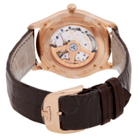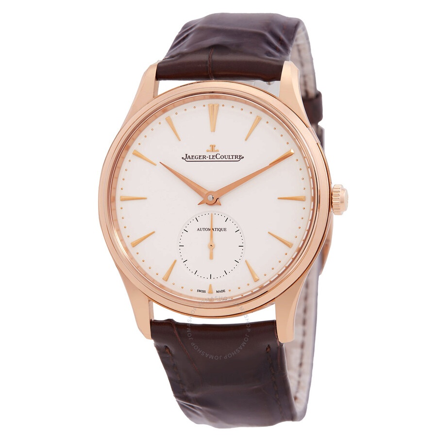 18kt pink gold case with a brown alligator leather strap. Fixed 18kt pink gold bezel. Eggshell beige dial with rose gold-tone hands and index hour markers. Dial Type: Analog. One subdial displaying: one- small second. Jaeger LeCoultre Calibre JLC 896/1 Automatic movement, based upon Jaeger-LeCoultre 896, containing 32 Jewels, composed of 223 parts, bitting at 28800 vph, and has a power reserve of approximately 43 hours. Scratch resistant sapphire crystal. Transparent see through case back. Round case shape, case size: 39 mm, case thickness: 11.55 mm. Band width: 21 mm. Buckle clasp. Water resistant at 50 meters / 165 feet. Functions: hour, minute, small second. Master Ultra Thin Series. Luxury watch style. Watch label: Swiss Made. Jaeger LeCoultre Master Ultra Thin Automatic Men's Watch Q1212510. GENERAL Box Type: Original Box CASE Case Diameter: 39 Case Thickness: 11.55 mm Case Material: 18kt Pink Gold Case Shape: Round Case Back: Transparent See Through BAND Band Material: Alligator Leather Band Type: Strap Band Color: Brown Band Width: 21 mm Clasp: Buckle DIAL Dial Color: Eggshell Beige Type: Analog Crystal: Scratch Resistant Sapphire Hands: Rose Gold-tone Dial Markers: Index Sub Dials: One- Small Second Bezel: Fixed Bezel Material: 18kt Pink Gold INFORMATION Brand: Jaeger LeCoultre Series: Master Ultra Thin Collection Name: Master Ultra Thin Gender: Mens Model: Q1212510 Watch Label: Swiss Made Movement: Automatic Engine: Jaeger LeCoultre Calibre JLC 896/1 Power Reserve: 43 hours FEATURES Water Resistance: 50 meters / 165 feet Functions: Hour, Minute, Small Second Watch Features: Alligator Leather, Analog, Gold, Leather ADDITIONAL INFO Watch Style: Luxury Warranty: 2 Year Jomashop Warranty Jomashop Sku: JLC-Q1212510 Department: Watches