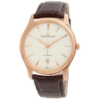 18kt rose gold case with a brown leather strap. Fixed 18kt rose gold bezel. Eggshell beige dial with index hour markers. Dial Type: Analog. Jaeger LeCoultre Calibre 899A/1 Automatic movement, based upon Jaeger LeCoultre 899, containing 32 Jewels, composed of 219 parts, bitting at 28800 vph, and has a power reserve of approximately 38 hours. Scratch resistant sapphire crystal. Transparent see through case back. Round case shape, case size: 39 mm, case thickness: 7.8 mm. Band width: 21 mm. Tang clasp. Water resistant at 50 meters / 165 feet. Functions: date, hour, minute, second. Master Series. Luxury watch style. Watch label: Swiss Made. Jaeger LeCoultre Master Ultra Thin Automatic Men's Watch Q1232510. CASE Case Size: 39 Case Thickness: 7.8 mm Case Material: 18kt Rose Gold Case Shape: Round Case Back: Transparent See Through BAND Band Material: Leather Band Type: Strap Band Color: Brown Band Width: 21 mm Clasp: Tang DIAL Dial Color: Eggshell beige Type: Analog Crystal: Scratch Resistant Sapphire Dial Markers: Index Bezel: Fixed Bezel Material: 18kt Rose Gold INFORMATION Brand: Jaeger LeCoultre Series: Master Collection Name: Master Gender: Mens Model: Q1232510 Watch Label: Swiss Made Movement: Automatic Engine: Jaeger LeCoultre Calibre 899A/1 Power Reserve: 38 hours FEATURES Water Resistance: 50 meters / 165 feet Functions: Date, Hour, Minute, Second Watch Features: Leather, Gold, Analog ADDITIONAL INFO Watch Style: Luxury Warranty: 2 Year Jomashop Warranty Jomashop Sku: JLC-Q1232510 Department: Watches Category: Watches