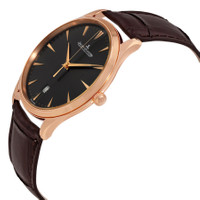 18kt rose gold case with a black leather strap. Fixed 18kt rose gold bezel. Slate grey dial with rose gold hands and index hour markers. Minute markers around the outer rim. Dial Type: Analog. Date display at the 6 o'clock position. Jaeger LeCoultre Calibre JLC 899/1 Automatic movement, containing 32 Jewels, composed of 219 parts, bitting at 28800 vph, and has a power reserve of approximately 38 hours. Scratch resistant sapphire crystal. Pull / push crown. Transparent case back. Round case shape, case size: 40 mm, case thickness: 7.5 mm. Band width: 18 mm. Tang clasp. Water resistant at 50 meters / 165 feet. Functions: date, hour, minute, second. Master Ultra Thin Series. Luxury watch style. Watch label: Swiss Made. Jaeger LeCoultre Master Ultra-Thin Automatic Men's Watch Q128255J. CASE Case Size: 40 Case Thickness: 7.5 mm Case Material: 18kt Rose Gold Case Shape: Round Case Back: Transparent BAND Band Material: Leather Band Type: Strap Band Color: Black Band Width: 18 mm Clasp: Tang DIAL Dial Color: Slate Grey Type: Analog Crystal: Scratch Resistant Sapphire Hands: Rose Gold Dial Markers: Index Second Markers: Minute Markers around the outer rim Bezel: Fixed Bezel Material: 18kt Rose Gold Crown: Pull / Push INFORMATION Brand: Jaeger LeCoultre Series: Master Ultra Thin Collection Name: Master Ultra Thin Gender: Mens Model: Q128255J Watch Label: Swiss Made Movement: Automatic Engine: Jaeger LeCoultre Calibre JLC 899/1 Power Reserve: 38 hours FEATURES Water Resistance: 50 meters / 165 feet Calendar: Date display at the 6 o'clock position Functions: Date, Hour, Minute, Second Watch Features: Leather, Gold, Analog ADDITIONAL INFO Watch Style: Luxury Warranty: 2 Year Jomashop Warranty UPC Code: 7630007176007 Jomashop Sku: JLC-Q128255J Department: Watches Category: Watches