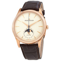 Brown leather strap. Fixed bezel. Eggshell beige dial with index hour markers. Dial Type: Analog. One subdial displaying: date/moonphase. Jaeger LeCoultre Calibre 925/1 Automatic movement, containing 38 Jewels, composed of 253 parts, bitting at 28800 vph, and has a power reserve of approximately 43 hours. Scratch resistant sapphire crystal. Transparent see through case back. Round case shape, case size: 39 mm, case thickness: 9 mm. Band width: 21 mm. Water resistant at 50 meters / 165 feet. Functions: moon phase, date, minute, second. Master Series. Luxury watch style. Watch label: Swiss Made. Jaeger Lecoultre Master Ultra Thin Automatic Men's Watch Q1362510. CASE Case Size: 39 Case Thickness: 9 mm Case Shape: Round Case Back: Transparent See Through BAND Band Material: Leather Band Type: Strap Band Color: Brown Band Width: 21 mm DIAL Dial Color: Eggshell Beige Type: Analog Crystal: Scratch Resistant Sapphire Dial Markers: Index Sub Dials: One - Date/Moonphase Bezel: Fixed INFORMATION Brand: Jaeger LeCoultre Series: Master Collection Name: Master Gender: Mens Model: Q1362510 Watch Label: Swiss Made Movement: Automatic Engine: Jaeger LeCoultre Calibre 925/1 Power Reserve: 70 hours FEATURES Water Resistance: 50 meters / 165 feet Functions: Moon Phase, Date, Minute, Second Watch Features: Moon Phase, Leather, Analog ADDITIONAL INFO Watch Style: Luxury Warranty: 2 Year Jomashop Warranty Jomashop Sku: JLC-Q1362510 Department: Watches Category: Watches