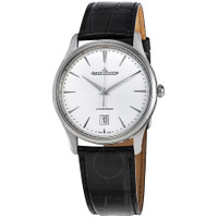 Stainless steel case with a black leather strap. Fixed stainless steel bezel. Silver dial with silver-tone dauphine-style hands and index hour markers. Minute markers around the outer rim. Dial Type: Analog. Date display above the 6 o'clock position. Jaeger LeCoultre calibre JLC 899/1 Automatic movement, containing 32 Jewels, composed of 219 parts, bitting at 28800 vph, and has a power reserve of approximately 38 hours. Scratch resistant sapphire crystal. Pull / push crown. Transparent case back. Round case shape. Case size: 39 mm. Case thickness: 7.8 mm. Deployment clasp. Water resistant at 50 meters / 165 feet. Functions: date, hour, minute, second. Master Ultra Thin Series. Luxury watch style. Watch label: Swiss Made. Jaeger LeCoultre Master Ultra Thin Automatic Silver Dial Men's Watch Q1238420. CASE Case Size: 39 Case Thickness: 7.8 mm Case Material: Stainless Steel Case Shape: Round Case Back: Transparent BAND Band Material: Leather Band Type: Strap Band Color: Black Clasp: Deployment DIAL Dial Color: Silver Type: Analog Crystal: Scratch Resistant Sapphire Hands: Silver-tone Dauphine-style Dial Markers: Index Second Markers: Minute Markers around the outer rim Bezel: Fixed Bezel Color: Silver-tone Bezel Material: Stainless Steel Crown: Pull / Push INFORMATION Brand: Jaeger LeCoultre Series: Master Ultra Thin Collection Name: Master Ultra Thin Gender: Mens Model: Q1238420 Watch Label: Swiss Made Movement: Automatic Engine: Jaeger LeCoultre Calibre JLC 899/1 Power Reserve: 43 hours FEATURES Water Resistance: 50 meters / 165 feet Calendar: Date display above the 6 o'clock position Functions: Date, Hour, Minute, Second Watch Features: Stainless Steel, Leather, Analog ADDITIONAL INFO Watch Style: Luxury Warranty: 2 Year Jomashop Warranty Jomashop Sku: JLC-Q1238420 Department: Watches Category: Watches
