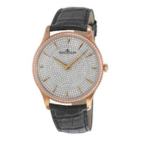 18kt pink gold case with a black alligator leather strap. Fixed 18kt pink gold bezel with diamond set. Gem-set dial with pink gold dauphine shaped hands and index hour markers. Dial Type: Analog. Jaeger LeCoultre Calibre JLC 898C Automatic movement, containing 29 Jewels, composed of 195 parts, bitting at 28800 vph, and has a power reserve of approximately 43 hours. Scratch resistant sapphire crystal. Pull / push crown. Transparent see through case back. Round case shape, case size: 40 mm, case thickness: 8.6 mm. Tang clasp. Water resistant at 50 meters / 165 feet. Functions: hour, minute. Master Ultra Thin Small Second Series. Luxury watch style. Watch label: Swiss Made. Item Variations: Q1352507, 1352507, 135.25.07, Q135.25.07. Jaeger LeCoultre Master Ultra Thin Small Second Gem-Set Dial Black Leather Men's Watch Q1352507. CASE Case Size: 40 Case Thickness: 8.6 mm Case Material: 18kt Pink Gold Case Shape: Round Case Back: Transparent See Through BAND Band Material: Alligator Leather Band Type: Strap Band Color: Black Clasp: Tang DIAL Dial Color: Gem-Set Type: Analog Crystal: Scratch Resistant Sapphire Hands: Pink Gold Dauphine Shaped Dial Markers: Index Bezel: Fixed Bezel Color: 18kt Pink Gold Bezel Material: Diamond Set Crown: Pull / Push INFORMATION Brand: Jaeger LeCoultre Series: Master Ultra Thin Small Second Collection Name: Master Ultra Thin Small Second Gender: Mens Model: Q1352507 Watch Label: Swiss Made Movement: Automatic Engine: Jaeger LeCoultre Calibre JLC 898C Power Reserve: 43 hours FEATURES Water Resistance: 50 meters / 165 feet Functions: Hour, Minute Watch Features: Diamond, Leather, Gold, Analog, Alligator Leather ADDITIONAL INFO Watch Style: Luxury Warranty: 2 Year Jomashop Warranty UPC Code: 845960065504 Jomashop Sku: JLC-Q1352507 Item Variation: Q1352507, 1352507, 135.25.07, Q135.25.07 Department: Watches Category: Watches