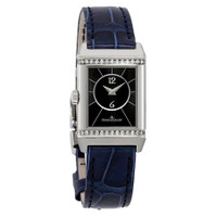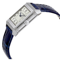 Stainless steel case with a blue leather strap. Fixed stainless steel bezel. Silver reverso dial with blue sword-shaped hands and black Arabic numeral hour markers. Minute markers around an inner ring. Dial Type: Analog. Jaeger LeCoultre calibre JLC 844 hand wind movement, containing 18 Jewels, bitting at 21600 vph, and has a power reserve of approximately 38 hours. Scratch resistant sapphire crystal. Pull / push crown. Solid case back. Rectangle case shape. Case dimensions: 34.2 mm x 21 mm. Case thickness: 8.7 mm. Deployment clasp. Water resistant at 30 meters / 100 feet. Functions: hour, minute. Additional Info: gems:diamond:~30 ~0.28 carats. Reverso Classic Series. Luxury watch style. Watch label: Swiss Made. Jaeger LeCoultre Reverso Classic Ladies Hand Wound Watch Q2668432. INFORMATION Brand: Jaeger LeCoultre Series: Reverso Classic Collection Name: Reverso Classic Gender: Womens Model: Q2668432 Watch Label: Swiss Made Movement: Hand Wind Engine: Jaeger LeCoultre Calibre JLC 844 Power Reserve: 38 hours CASE Case Size: 34.2 mm x 21 mm Case Thickness: 8.7 mm Case Material: Stainless Steel Case Shape: Rectangle Case Back: Solid BAND Band Material: Alligator Leather Band Type: Strap Band Color: Blue Clasp: Deployment DIAL Dial Color: Silver Reverso Type: Analog Crystal: Scratch Resistant Sapphire Hands: Blue Sword-shaped Dial Markers: Black Arabic Numeral Second Markers: Minute Markers around an inner ring Bezel: Fixed Bezel Color: Silver-tone Bezel Material: Stainless Steel Crown: Pull / Push FEATURES Water Resistance: 30 meters / 100 feet Functions: Hour, Minute Watch Features: Diamond, Stainless Steel, Leather, Analog ADDITIONAL INFO Watch Style: Luxury Warranty: 2 Year Jomashop Warranty UPC Code: 7630053300050 Additional Info: Gems:Diamond:~30 ~0.28 carats Jomashop Sku: JLC-Q2668432 Department: Watches Category: Watches