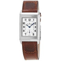 Stainless steel case with a brown (calfskin ) leather strap. Fixed stainless steel bezel. Silvered grey (black reverso) dial with blue sword-shaped hands and black Arabic numeral hour markers. Minute markers around an inner ring. Dial Type: Analog. Small seconds sub-dial. Jaeger LeCoultre calibre JLC 854A/2 hand wind movement, containing 19 Jewels, composed of 160 parts, bitting at 21600 vph, and has a power reserve of approximately 42 hours. Scratch resistant sapphire crystal. Pull / push crown. Solid case back. Rectangle case shape. Case dimensions: 42.9 mm x 25.5 mm. Case thickness: 7.5 mm. Tang clasp. Water resistant at 30 meters / 100 feet. Functions: hour, minute, small second, two time zones. Reverso Classic Medium Duoface Series. Luxury watch style. Watch label: Swiss Made. Jaeger Lecoultre Reverso Classic Medium Duoface Men's Handwound Watch Q2458422. CASE Case Size: 42 Case Thickness: 7.5 mm Case Material: Stainless Steel Case Shape: Rectangle Case Back: Solid BAND Band Material: (Calfskin ) Leather Band Type: Strap Band Color: Brown Clasp: Tang DIAL Dial Color: Silvered Grey (Black Reverso) Type: Analog Crystal: Scratch Resistant Sapphire Hands: Blue Sword-shaped Dial Markers: Black Arabic Numeral Second Markers: Minute Markers around an inner ring Sub Dials: Small Seconds Bezel: Fixed Bezel Color: Silver-tone Bezel Material: Stainless Steel Crown: Pull / Push INFORMATION Brand: Jaeger LeCoultre Series: Reverso Classic Medium Duoface Collection Name: Reverso Classic Medium Duoface Gender: Mens Model: Q2458422 Watch Label: Swiss Made Movement: Hand Wind Engine: Jaeger LeCoultre Calibre JLC 854A/2 Power Reserve: 42 hours FEATURES Water Resistance: 30 meters / 100 feet Functions: Hour, Minute, Small Second, Two Time Zones Watch Features: Time Zone, Stainless Steel, Leather, Analog ADDITIONAL INFO Watch Style: Luxury Warranty: 2 Year Jomashop Warranty Jomashop Sku: JLC-Q2458422 Department: Watches Category: Watches
