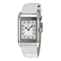 Silver-tone stainless steel case with a white crocodile leather strap. Fixed silver-tone stainless steel bezel. Black and silver interchangeable dial with blue sword-shaped hands and black Arabic numeral hour markers. Minute markers around an inner ring. Dial Type: Analog. Jaeger LeCoultre Calibre JLC 854/1 Hand Wind movement, based upon JLC 844, containing 21 Jewels, composed of 180 parts, bitting at 21600 vph, and has a power reserve of approximately 45 hours. Scratch resistant sapphire crystal. Solid case back. Rectangle case shape, case size: 42 mm x 25 mm, case thickness: 9 mm. Fold over deployment clasp. Water resistant at 30 meters / 100 feet. Functions: hour, minute. Luxury watch style. Watch label: Swiss Made. Item Variations: Q2698420, 2698420, 269.84.20, Q269.84.20. Jaeger LeCoultre Reverso Duetto Duo White Leather Ladies Watch Q2698420. GENERAL Color: Black / Silver / White INFORMATION Brand: Jaeger LeCoultre Series: Reverso Duetto Duo Collection Name: Reverso Duetto Duo Gender: Womens Model: Q2698420 Watch Label: Swiss Made Movement: Hand Wind Engine: Jaeger LeCoultre Calibre JLC 854/1 Power Reserve: 45 hours CASE Case Size: 42 mm x 25 mm Case Thickness: 9 mm Case Material: Stainless Steel Case Shape: Rectangle Case Back: Solid BAND Band Material: Crocodile Leather Band Type: Strap Band Color: White Clasp: Fold Over Deployment DIAL Dial Color: Black and Silver Interchangeable Type: Analog Crystal: Scratch Resistant Sapphire Hands: Blue Sword-shaped Dial Markers: Black Arabic Numeral Second Markers: Minute Markers around an inner ring Bezel: Fixed Bezel Color: Silver-tone Bezel Material: Stainless Steel FEATURES Water Resistance: 30 meters / 100 feet Functions: Hour, Minute Watch Features: Stainless Steel, Leather, Analog ADDITIONAL INFO Watch Style: Luxury Warranty: 2 Year Jomashop Warranty UPC Code: 7630007127818 Jomashop Sku: JLC-Q2698420 Item Variation: Q2698420, 2698420, 269.84.20, Q269.84.20 Department: Watches Category: Watches