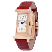 18kt rose gold case with a red alligator band. Fixed 18kt rose gold bezel. White dial with blue dauphine-style shape hands and Arabic numeral hour markers. Minute markers around the outer rim. Dial Type: Analog. One subdial displaying: moonphase on back. Jaeger LeCoultre Calibre 842 Hand Wind movement, containing 19 Jewels, bitting at 21600 vph, and has a power reserve of approximately 38 hours. Scratch resistant sapphire crystal. Screw down crown. Solid case back. Square case shape, case size: 40.1 mm x 20 mm, case thickness: 10 mm. Deployment clasp. Water resistant at 30 meters / 100 feet. Functions: moon phase, hour, minute. Reverso Series. Luxury watch style. Watch label: Swiss Made. Jaeger LeCoultre Reverso Hand Wind White Dial Ladies Watch Q3352420. INFORMATION Brand: Jaeger LeCoultre Series: Reverso Collection Name: Reverso Gender: Womens Model: Q3352420 Watch Label: Swiss Made Movement: Hand Wind Engine: Jaeger LeCoultre Calibre 842 Power Reserve: 38 hours CASE Case Size: 40.1 mm x 20 mm Case Thickness: 10 mm Case Material: 18kt Rose Gold Case Shape: Square Case Back: Solid BAND Band Material: Alligator Band Type: Strap Band Color: Red Clasp: Deployment DIAL Dial Color: White Type: Analog Crystal: Scratch Resistant Sapphire Hands: Blue Dauphine-style shape Dial Markers: Arabic Numeral Second Markers: Minute Markers around the outer rim Sub Dials: One - Moonphase on back Bezel: Fixed Bezel Material: 18kt Rose Gold Crown: Screw Down FEATURES Water Resistance: 30 meters / 100 feet Functions: Moon Phase, Hour, Minute Watch Features: Moon Phase, Gold, Analog, Alligator Leather ADDITIONAL INFO Watch Style: Luxury Warranty: 2 Year Jomashop Warranty UPC Code: 611393855643 Jomashop Sku: JLC-Q3352420 Department: Watches Category: Watches