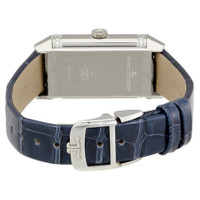 Silver-tone stainless steel case with a blue alligator leather strap. Fixed silver-tone stainless steel bezel. Silver dial with blue dauphine-style shape hands and Arabic numeral hour markers. Minute markers around the outer rim. Dial Type: Analog. One subdial displaying: moonphase on back. Jaeger LeCoultre Calibre 842 Hand Wind movement, containing 19 Jewels, bitting at 21600 vph, and has a power reserve of approximately 38 hours. Scratch resistant sapphire crystal. Pull / push crown. Solid case back. Rectangle case shape, case size: 40 mm x 20 mm, case thickness: 10 mm. Fold over with safety release clasp. Water resistant at 30 meters / 100 feet. Functions: hour, minute, moonphase. Reverso One Duetto Series. Luxury watch style. Watch label: Swiss Made. Jaeger LeCoultre Reverso One Duetto Moonphase Ladies Watch Q3358420. INFORMATION Brand: Jaeger LeCoultre Series: Reverso One Duetto Collection Name: Reverso One Duetto Gender: Womens Model: Q3358420 Watch Label: Swiss Made Movement: Hand Wind Engine: Jaeger LeCoultre Calibre 842 Power Reserve: 38 hours CASE Case Size: 40 mm x 20 mm Case Thickness: 10 mm Case Material: Stainless Steel Case Shape: Rectangle Case Back: Solid BAND Band Material: Alligator Leather Band Type: Strap Band Color: Blue Clasp: Fold Over with Safety Release DIAL Dial Color: Silver Type: Analog Crystal: Scratch Resistant Sapphire Hands: Blue Dauphine-style shape Dial Markers: Arabic Numeral Second Markers: Minute Markers around the outer rim Sub Dials: One - Moonphase on back Bezel: Fixed Bezel Color: Silver-tone Bezel Material: Stainless Steel Crown: Pull / Push FEATURES Water Resistance: 30 meters / 100 feet Functions: Hour, Minute, Moonphase Watch Features: Stainless Steel, Leather, Analog, Alligator Leather ADDITIONAL INFO Watch Style: Luxury Warranty: 2 Year Jomashop Warranty UPC Code: 7630007176335 Jomashop Sku: JLC-Q3358420 Department: Watches Category: Watches