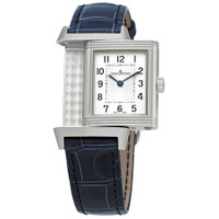 Silver-tone stainless steel case with a blue leather strap. Fixed silver-tone stainless steel bezel. Silvered grey dial with blue hands and Arabic numeral hour markers. Minute markers around the inner rim. Dial Type: Analog. Jaeger LeCoultre Calibre JLC 846 Hand Wind movement, containing 18 Jewels, composed of 93 parts, bitting at 21600 vph, and has a power reserve of approximately 40 hours. Scratch resistant sapphire crystal. Pull / push crown. Solid case back. Rectangle case shape, case size: 35.78 x 21 mm, case thickness: 7.4 mm. Band width: 15 mm. Double folding buckle clasp. Water resistant at 30 meters / 100 feet. Functions: hour, minute. Reverso Classic Series. Luxury watch style. Watch label: Swiss Made. Jaeger LeCoultre Reverso Classic Hand Wind Ladies Watch Q2608440. INFORMATION Brand: Jaeger LeCoultre Series: Reverso Classic Collection Name: Reverso Classic Gender: Womens Model: Q2608440 Watch Label: Swiss Made Movement: Hand Wind Engine: Jaeger LeCoultre Calibre JLC 846 CASE Case Size: 35.78 x 21 mm Case Thickness: 7.4 mm Case Material: Stainless Steel Case Shape: Rectangle Case Back: Solid BAND Band Material: Leather Band Type: Strap Band Color: Blue Band Width: 15 mm Clasp: Double Folding Buckle DIAL Dial Color: Silvered Grey Type: Analog Crystal: Scratch Resistant Sapphire Hands: Blue Dial Markers: Arabic Numeral Second Markers: Minute Markers around the inner rim Bezel: Fixed Bezel Color: Silver-tone Bezel Material: Stainless Steel Crown: Pull / Push FEATURES Water Resistance: 30 meters / 100 feet Functions: Hour, Minute Watch Features: Stainless Steel, Leather, Analog ADDITIONAL INFO Watch Style: Luxury Warranty: 2 Year Jomashop Warranty Jomashop Sku: JLC-Q2608440 Department: Watches Category: Watches