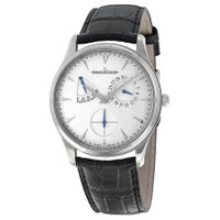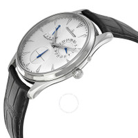 Stainless steel case with a black (alligator) leather strap. Fixed stainless steel bezel. Silver dial with silver-tone hands and stick hour markers. Minute markers around the outer rim. Dial Type: Analog. Date display at the 2 o'clock position. Three sub-dials displaying: 60 second, date and power reserve indicator. Jaeger LeCoultre calibre JLC 938 automatic movement, containing 41 Jewels, composed of 273 parts, bitting at 28800 vph, and has a power reserve of approximately 43 hours. Scratch resistant sapphire crystal. Pull / push crown. Skeleton case back. Round case shape. Case size: 39 mm. Case thickness: 10 mm. Deployment clasp with a push button release. Water resistant at 30 meters / 100 feet. Functions: date, hour, minute, small second, power reserve indicator. Additional Info: power reserve indicator on dial. Master Ultra Thin Reserve De Marche Series. Luxury watch style. Watch label: Swiss Made. Item Variations: Q1378420, 1378420, 137.84.20, Q137.84.20. Jaeger LeCoultre Ultra Thin Reserve de Marche Automatic Men's Watch Q1378420. GENERAL Color: Black / Silver / Skeleton INFORMATION Brand: Jaeger LeCoultre Series: Master Ultra Thin Reserve De Marche Collection Name: Master Ultra Thin Reserve de Marche Gender: Mens Model: Q1378420 Watch Label: Swiss Made Movement: Automatic Engine: Jaeger LeCoultre Calibre JLC 938 Power Reserve: 43 hours CASE Case Size: 39 mm Case Thickness: 10 mm Case Material: Stainless Steel Case Shape: Round Case Back: Skeleton BAND Band Material: Alligator Leather Band Type: Strap Band Color: Black Clasp: Deployment with Push Button Release DIAL Dial Color: Silver Type: Analog Crystal: Scratch Resistant Sapphire Hands: Silver-tone Dial Markers: Stick Second Markers: Minute Markers around the outer rim Sub Dials: Three - 60 Second, Date and Power Reserve Indicator Bezel: Fixed Bezel Color: Silver-tone Bezel Material: Stainless Steel Crown: Pull / Push FEATURES Water Resistance: 30 meters / 100 feet Calendar: Date display at the 2 o'clock position Functions: Date, Hour, Minute, Small Second, Power Reserve Indicator Watch Features: Stainless Steel, Leather, Power Reserve Indicator, Analog, Alligator Leather ADDITIONAL INFO Watch Style: Luxury Warranty: 2 Year Jomashop Warranty UPC Code: 7630007138913 Additional Info: Power reserve indicator on dial Jomashop Sku: JLC-Q1378420 Item Variation: Q1378420, 1378420, 137.84.20, Q137.84.20 Department: Watches Category: Watches