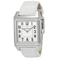 Silver-tone stainless steel case with a white leather strap. Fixed silver-tone bezel with diamond set. White dial with silver-toned sword-shaped hands and black Arabic numeral hour markers. Minute markers aroundan inner ring. Dial Type: Analog. Jaeger LeCoultre Calibre JLC 657 quartz movement. Scratch resistant sapphire crystal. Pull / push crown. Solid case back. Rectangle case shape, case size: 45.5 mm x 31.2 mm, case thickness: 12 mm. Deployment clasp. Water resistant at 50 meters / 165 feet. Functions: hour, minute. Reverso Squadra Classic Series. Luxury watch style. Watch label: Swiss Made. Item Variations: Q7068421, 7068421, 706.84.21, Q706.84.21. Jaeger LeCoultre White Dial White Leather Ladies Watch Q7068421. GENERAL Color: White INFORMATION Brand: Jaeger LeCoultre Series: Reverso Squadra Classic Collection Name: Reverso Squadra Classic Gender: Womens Model: Q7068421 Watch Label: Swiss Made Movement: Quartz Engine: Jaeger LeCoultre Calibre JLC 657 CASE Case Size: 45.5 mm x 31.2 mm Case Thickness: 12 mm Case Material: Stainless Steel Case Shape: Rectangle Case Back: Solid BAND Band Material: Leather Band Type: Strap Band Color: White Clasp: Deployment DIAL Dial Color: White Type: Analog Crystal: Scratch Resistant Sapphire Hands: Silver-toned Sword-shaped Dial Markers: Black Arabic Numeral Second Markers: Minute Markers aroundan inner ring Bezel: Fixed Bezel Color: Silver-tone Bezel Material: Diamond Set Crown: Pull / Push FEATURES Water Resistance: 50 meters / 165 feet Functions: Hour, Minute Watch Features: Diamond, Stainless Steel, Leather ADDITIONAL INFO Watch Style: Luxury Warranty: 2 Year Jomashop Warranty UPC Code: 611393811281 Jomashop Sku: JLC-Q7068421 Item Variation: Q7068421, 7068421, 706.84.21, Q706.84.21 Department: Watches Category: Watches