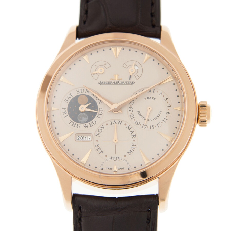 Pre-owned 18kt rose gold case with a black alligator leather strap. Fixed 18kt rose gold bezel. Beige dial with pink gold-tone hands and index hour markers. Minute markers around the outer rim. Dial Type: Analog. Perpetual calendar. Three sub-dials displaying: day (moonphase), date and month. Jaeger LeCoultre Calibre JLC 876-440B Hand Wind movement, containing 37 Jewels, composed of 262 parts, bitting at 28800 vph, and has a power reserve of approximately 192 hours. Scratch resistant sapphire crystal. Round case shape, case size: 40 mm, case thickness: 6.6 mm. Functions: perpetual calendar, moon phase, year, month, date, day, hour, minute, second, power reserve indicator, red security zone. Master Control Series. Luxury watch style. Watch label: Swiss Made. Jaeger LeCoultre Master Control Beige Dial 18K Pink Gold Men's Watch Q1612520. GENERAL Collection Name: Master Control INFORMATION Brand: Jaeger LeCoultre Series: Master Control Model: Q1612520 Gender: Mens Watch Label: Swiss Made Movement: Hand Wind Engine: Jaeger LeCoultre Calibre JLC 876-440B Power Reserve: 192 hours / 8 days CONDITION INFORMATION Box: No Preowned Item Condition: Very Good Papers: Yes CASE Case Size: 40 mm Case Thickness: 6.6 mm Case Material: 18kt Rose Gold Case Shape: Round DIAL Type: Analog Dial Color: Beige Crystal: Scratch Resistant Sapphire Hands: Pink Gold-Tone Second Markers: Minute Markers around the outer rim Dial Markers: Index Sub Dials: Three - Day (Moonphase), Date and Month Bezel: Fixed Bezel Material: 18kt Rose Gold BAND Band Type: Strap Band Material: Alligator Leather Band Color: Black FEATURES Calendar: Perpetual Calendar Functions: Perpetual Calendar, Moon Phase, Year, Month, Date, Day, Hour, Minute, Second, Power Reserve Indicator, Red Security Zone Watch Features: Alligator Leather, Analog, Power Reserve Indicator, Month, Perpetual, Gold, Leather, Moon Phase ADDITIONAL INFO Watch Style: Luxury Warranty: 1 Year Jomashop Warranty UPC Code: 611393855407 Jomashop Sku: PRE-P-JLC77577 Department: Watches Category: Watches