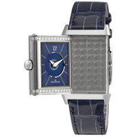 Pre-owned Silver-tone stainless steel case with a blue leather strap. Fixed silver-tone bezel with diamond set. Arabic numeral hour markers. Dial Type: Analog. Jaeger LeCoultre Calibre 968A hand wind movement with a 38-hour power reserve. Scratch resistant sapphire crystal. Pull / push crown. Rectangle case shape, case size: 40 x 24.4 mm, case thickness: 9.5 mm. Band width: 18 mm. Deployment clasp. Water resistant at 30 meters / 100 feet. Functions: hour, minute. Additional Info: 60, diamond, ~0.85 cts. Reverso Series. Dress watch style. Watch label: Swiss Made. Jaeger LeCoultre Reverso Medium Duetto Diamond Ladies Watch Q2578480. GENERAL Preowned Item Condition: Excellent CASE Case Thickness: 9.5 mm Case Material: Stainless Steel Case Shape: Rectangle BAND Band Material: Leather Band Type: Strap Band Color: Blue Band Width: 18 mm Clasp: Deployment DIAL Dial Color: White Type: Analog Crystal: Scratch Resistant Sapphire Hands: Blue Dial Markers: Arabic Numeral Bezel: Fixed Bezel Color: Silver-tone Bezel Material: Diamond Set Crown: Pull / Push INFORMATION Brand: Jaeger LeCoultre Series: Reverso Collection Name: Reverso Gender: Womens Model: Q2578480 Watch Label: Swiss Made Movement: Hand Wind Engine: Jaeger LeCoultre Calibre 968A Power Reserve: 38 hours FEATURES Water Resistance: 30 meters / 100 feet Functions: Hour, Minute Watch Features: Analog, Leather, Stainless Steel, Diamond ADDITIONAL INFO Watch Style: Dress Warranty: 1 Year Jomashop Warranty Additional Info: 60, Diamond, ~0.85 cts Jomashop Sku: PRE-P-JLC101952 Department: Watches Category: Watches