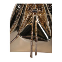 Jimmy Choo Ladies Bucket Bag. SKU: J000147188-GOLD. Color: Gold. Size: L 3.4" x H 5.9" x W 5.51". Jimmy Choo Bon Bon Tassel Detailing Bucket Bag. This bag features a statement ring handle, elegant chain shoulder strap, and a drawstring closure, all crafted in liquid metal leather with polished gold hardware. 100% Leather. Made in Italy. GENERAL Size Info: L 3.4" x H 5.9" x W 5.51" Brand Type: Designer Color: Gold INFORMATION Brand: Jimmy Choo Gender: Womens Model: J000147188-GOLD DETAILS Material: Leather ADDITIONAL INFO UPC Code: 194611984191 Jomashop Sku: Z-H2XTJ Department: Bags Category: Bucket Bag