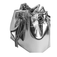 Jimmy Choo Ladies Bucket Bag. SKU: J000147189-SILVER. Color: Silver. Size: L 3.4" x H 5.9" x W 5.51". Jimmy Choo Bon Bon Tassel Detailing Bucket Bag. This bag is crafted from silver liquid metal leather and features a bold ring handle, a delicate chain shoulder strap, and a sleek drawstring closure, all finished with coordinating silver hardware. 100% Leather. Made in Italy. GENERAL Size Info: L 3.4" x H 5.9" x W 5.51" Brand Type: Designer Color: Silver INFORMATION Brand: Jimmy Choo Gender: Womens Model: J000147189-SILVER DETAILS Material: Leather ADDITIONAL INFO UPC Code: 196176001078 Jomashop Sku: Z-V9YDP Department: Bags Category: Bucket Bag