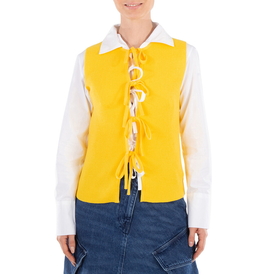 JW Anderson Ladies Tops. Fashion category: Vests. SKU: KW1140-YN0327-BRIGHT YELLOW. Color: Yellow. JW Anderson Bow Tie Tank Top. A soft rib-knit tank top featuring a sleeveless design, a crewneck, a fitted silhouette, sweet bow ties, and a gold-tone branded plaque at the back. 50% Cotton, 43% Polyester, 6% Polyamide, 1% Elastane. GENERAL Color: Yellow INFORMATION Brand: Jw Anderson Gender: Womens Model: KW1140-YN0327-BRIGHT YELLOW DETAILS Category: Tops Apparel Type: Vests Material: Cotton, Elastane, Polyamide, Polyester ADDITIONAL INFO Jomashop Sku: -0YN0327BRIGHTYELLOW Department: Clothing