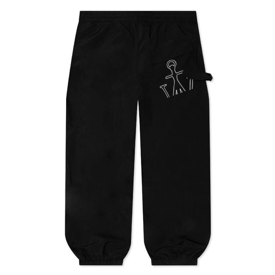 JW Anderson Men's Bottoms. Fashion category: Pants & Leggings. SKU: TR0282-PG1345-BLACK. Color: Black. JW Anderson Twisted Cargo Pants In Black. The mid-rise JW Anderson track pants showcase an asymmetric design adorned with an anchor print and an embroidered logo on the leg. They feature a wide leg silhouette with elasticated ankles and waistband, offering a comfortable slip-on style. Additionally, the pants include a practical side flap pocket for added functionality. 100% Nylon. GENERAL Color: Black INFORMATION Brand: JW Anderson Gender: Mens Model: TR0282-PG1345-BLACK DETAILS Category: Bottoms Apparel Type: Pants & Leggings Material: Nylon ADDITIONAL INFO Jomashop Sku: -TR0282PG1345BLACK Department: Clothing