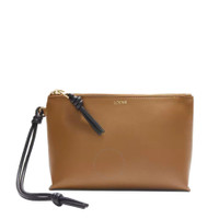 Loewe Ladies Pouch. SKU: CEM1KNPX01.3987. Barcode: 8445555414919. Color: Oak/Black. Size: Height 15.5cm x Width 22.5cm x Depth 5.5cm. Loewe Knot T Calfskin Pouch In Oak / Black.The Knot T pouch by LOEWE is a versatile accessory crafted from shiny nappa calfskin leather. It features a contrasting knot zip pull and wristlet, allowing for hand or wrist carry. The pouch includes one main compartment with two card slots, a zip closure, and is lined with herringbone cotton canvas. A gold-embossed LOEWE logo adorns the front. Main material: Shiny Nappa Calf Leather. Made in Spain. GENERAL Size Info: Height 15.5cm x Width 22.5cm x Depth 5.5cm Brand Type: Designer Color: Oak/Black INFORMATION Brand: Loewe Gender: Womens Model: CEM1KNPX01.3987 DETAILS Material: Calfskin Closure: Zip-Up ADDITIONAL INFO UPC Code: 8445555414919 Jomashop Sku: Z-UUSJA Department: Bags Category: Pouch