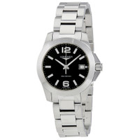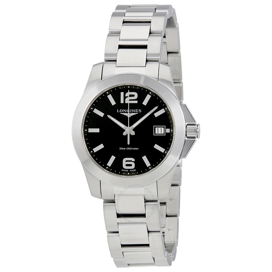 Stainless steel case with a stainless steel bracelet. Fixed stainless steel bezel. Black dial with luminous silver-tone hands and index hour markers. Arabic numerals mark the 6 and 12 o'clock positions. minute markers around the outer rim. Dial Type: Analog. Date display at the 3 o'clock position. Longines calibre L156 quartz movement. Scratch resistant sapphire crystal. Screw down crown. Solid case back. Case size: 34 mm. Round case shape. Band width: 17 mm. Deployment clasp. Water resistant at 300 meters / 1000 feet. Functions: date, hour, minute, second. Dress watch style. Watch label: Swiss Made. Longines Conquest Black Dial Ladies Watch L33774586. INFORMATION Brand: Longines Series: Conquest Collection Name: Conquest Gender: Womens Model: L33774586 Watch Label: Swiss Made Movement: Quartz Engine: Longines Calibre L156 CASE Case Size: 34 mm Case Material: Stainless Steel Case Shape: Round Case Back: Solid BAND Band Material: Stainless Steel Band Type: Bracelet Band Color: Silver-tone Band Width: 17 mm Clasp: Deployment DIAL Dial Color: Black Type: Analog Crystal: Scratch Resistant Sapphire Hands: Luminous Silver-tone Dial Markers: Index Second Markers: Arabic Numerals mark the 6 and 12 o'clock positions. Minute Markers around the outer rim Luminiscence: Hands and Markers Bezel: Fixed Bezel Color: Silver-tone Bezel Material: Stainless Steel Crown: Screw Down FEATURES Water Resistance: 300 meters / 1000 feet Calendar: Date display at the 3 o'clock position Functions: Date, Hour, Minute, Second Watch Features: Stainless Steel, Analog ADDITIONAL INFO Watch Style: Dress Warranty: 2 Year Jomashop Warranty UPC Code: 703200188546 Jomashop Sku: LNG33774586 Department: Watches Category: Watches