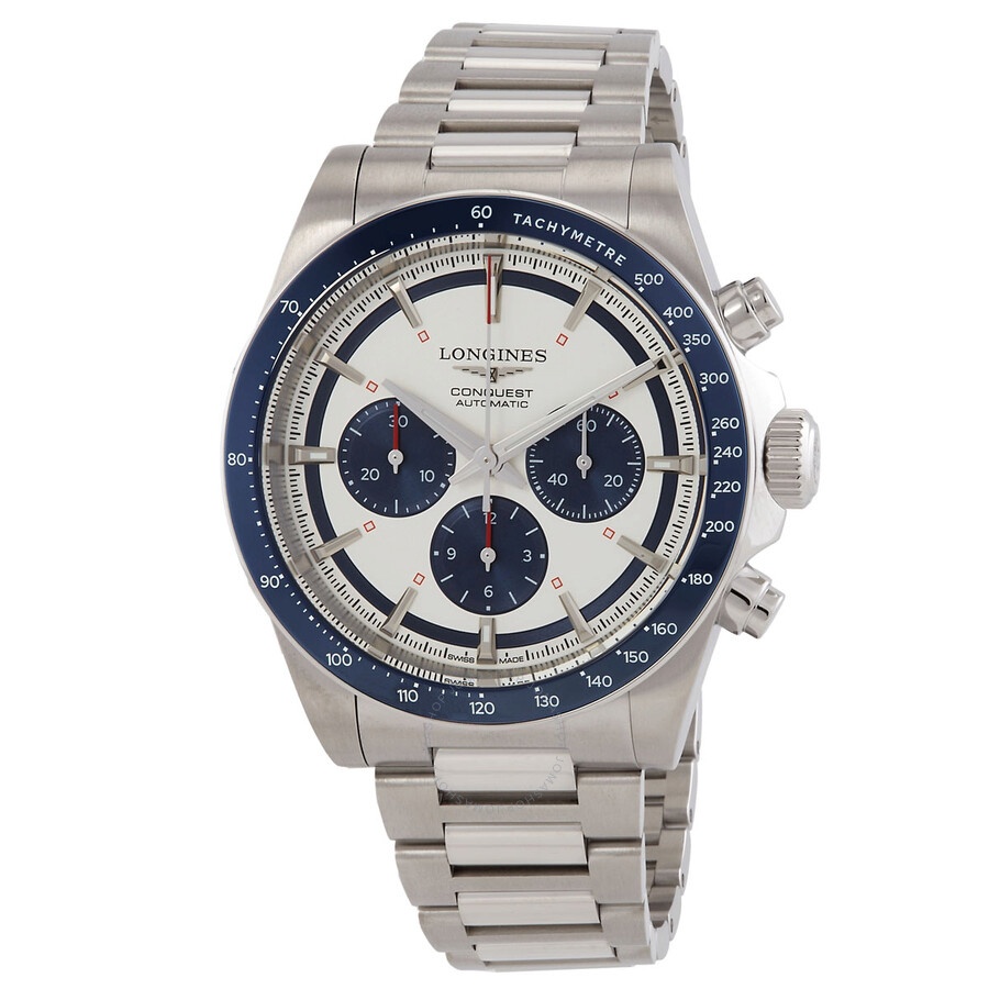 Silver-tone stainless steel case and bracelet. Fixed tachymeter scale blue stainless steel bezel. Silver-tone dial with silver-tone hands and index hour markers. Minute markers around the outer rim. Dial Type: Analog. Luminescent hands and markers. Chronograph - three sub-dials displaying: 60 second, 30 minute and 12 hour. Longines Calibre L898 automatic movement with a 59-hour power reserve. Scratch resistant sapphire crystal. Transparent see through case back. Round case shape, case size: 42 mm. Fold over clasp with a safety release. Water resistant at 100 meters / 330 feet. Functions: chronograph, hour, minute, second. Conquest Series. Luxury watch style. Watch label: Swiss Made. Longines Conquest Chronograph Automatic Silver Dial Men's Watch L3.835.4.98.6. GENERAL Box Type: Original Box CASE Case Size: 42 Case Material: Stainless Steel Case Shape: Round Case Back: Transparent See Through BAND Band Material: Stainless Steel Band Type: Bracelet Band Color: Silver-tone Clasp: Fold Over with Safety Release DIAL Dial Color: Silver-tone Type: Analog Crystal: Scratch Resistant Sapphire Hands: Silver-tone Dial Markers: Index Second Markers: Minute Markers around the outer rim Sub Dials: Three - 60 Second, 30 Minute and 12 Hour Luminiscence: Hands and Markers Bezel: Fixed Tachymeter Scale Bezel Color: Blue Bezel Material: Stainless Steel INFORMATION Brand: Longines Series: Conquest Collection Name: Conquest Gender: Mens Model: L3.835.4.98.6 Watch Label: Swiss Made Movement: Automatic Engine: Longines Calibre L898 Power Reserve: 59 hours FEATURES Water Resistance: 100 meters / 330 feet Functions: Chronograph, Hour, Minute, Second Watch Features: Analog, Stainless Steel, Chronograph ADDITIONAL INFO Watch Style: Luxury Warranty: 2 Year Jomashop Warranty Jomashop Sku: LNG38354986 Department: Watches