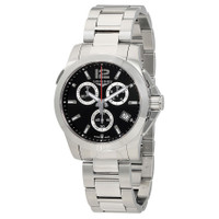 Stainless steel case with a stainless steel bracelet. Fixed stainless steel bezel. Black dial with luminous silver-tone hands and index hour markers. An Arabic numeral appears at the 12 o'clock position. Minute markers around the outer rim. Dial Type: Analog. Luminescent hands and markers. Date display at the 4 o'clock position. Chronograph - three sub-dials displaying: 60 second, 30 minute and 1/10 second counter. Longines calibre L442 quartz movement. Scratch resistant sapphire crystal. Screw down crown. Solid case back. Round case shape. Case size: 41 mm. Case thickness: 15.15 mm. Band width: 21 mm. Butterfly clasp. Water resistant at 300 meters / 1000 feet. Functions: chronograph, date, hour, minute, second. Conquest Series. Dive watch style. Watch label: Swiss Made. Longines Conquest Chronograph Quartz Black Dial Men's Watch L3.702.4.56.6. GENERAL Box Type: Original Box CASE Case Size: 41 Case Thickness: 15.15 mm Case Material: Stainless Steel Case Shape: Round Case Back: Solid BAND Band Material: Stainless Steel Band Type: Bracelet Band Color: Silver-tone Band Width: 21 mm Clasp: Butterfly DIAL Dial Color: Black Type: Analog Crystal: Scratch Resistant Sapphire Hands: Luminous Silver-tone Dial Markers: Index Second Markers: Arabic Numeral appears at the 12 o'clock position. Minute Markers around the outer rim Sub Dials: Three - 60 Second, 30 Minute and 1/10 Second Counter Luminiscence: Hands and Markers Bezel: Fixed Bezel Color: Silver-tone Bezel Material: Stainless Steel Crown: Screw Down INFORMATION Brand: Longines Series: Conquest Collection Name: Conquest Gender: Mens Model: L3.702.4.56.6 Watch Label: Swiss Made Movement: Quartz Engine: Longines Calibre L442 FEATURES Water Resistance: 300 meters / 1000 feet Calendar: Date display at the 4 o'clock position Functions: Chronograph, Date, Hour, Minute, Second Watch Features: Analog, Stainless Steel, Chronograph ADDITIONAL INFO Watch Style: Dive Warranty: 2 Year Jomashop Warranty UPC Code: 7612356188597 Jomashop Sku: LNG37024566 Department: Watches Category: Watches