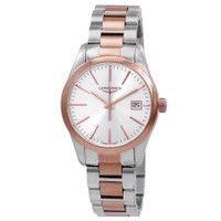 Stainless steel case with a two-tone (silver-tone and red gold PVD) stainless steel bracelet. Fixed red gold PVD bezel. Sunray silver dial with red gold-tone hands and index hour markers. Minute markers around the outer rim. Dial Type: Analog. Date display at the 3 o'clock position. Longines calibre L156 quartz movement. Scratch resistant sapphire crystal. Pull / push crown. Solid case back. Round case shape. Case size: 34 mm. Case thickness: 8.9 mm. Band width: 17 mm. Triple fold over clasp. Water resistant at 50 meters / 165 feet. Functions: date, hour, minute, second. Conquest Classic Series. Dress watch style. Watch label: Swiss Made. Longines Conquest Classic Quartz Ladies Watch L2.386.3.72.7. INFORMATION Brand: Longines Series: Conquest Classic Collection Name: Conquest Classic Gender: Womens Model: L2.386.3.72.7 Watch Label: Swiss Made Movement: Quartz Engine: Longines Calibre L156 CASE Case Size: 34 mm Case Thickness: 8.9 mm Case Material: Stainless Steel Case Shape: Round Case Back: Solid BAND Band Material: Stainless Steel Band Type: Bracelet Band Color: Two-tone (Silver-tone and Red Gold PVD) Band Width: 17 mm Clasp: Triple Fold Over DIAL Dial Color: Sunray Silver Type: Analog Crystal: Scratch Resistant Sapphire Hands: Red Gold-tone Dial Markers: Index Second Markers: Minute Markers around the outer rim Bezel: Fixed Bezel Color: Red Gold PVD Bezel Material: Stainless Steel Crown: Pull / Push FEATURES Water Resistance: 50 meters / 165 feet Calendar: Date display at the 3 o'clock position Functions: Date, Hour, Minute, Second Watch Features: Stainless Steel, Gold, Analog ADDITIONAL INFO Watch Style: Dress Warranty: 2 Year Jomashop Warranty UPC Code: 7612356212995 Jomashop Sku: LNG23863727 Department: Watches Category: Watches