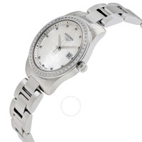 Stainless steel case with a stainless steel bracelet. Fixed stainless steel bezel set with diamonds. Mother of pearl dial with silver-tone hands and diamond hour markers. Minute markers around the outer rim. Dial Type: Analog. Date display at the 3 o'clock position. Quartz movement. Scratch resistant sapphire crystal. Case size: 36 mm. Case thickness: 9 mm. Round case shape. Deployment clasp. Water resistant at 300 meters / 1000 feet. Functions: date, hour, minute, second. Luxury watch style. Watch label: Swiss Made. Longines Conquest Mother of Pearl Dial Diamond Ladies Watch L3.401.0.87.6. INFORMATION Brand: Longines Series: Conquest Collection Name: Conquest Gender: Womens Model: L3.401.0.87.6 Watch Label: Swiss Made Movement: Quartz CASE Case Size: 36 mm Case Thickness: 9 mm Case Material: Stainless Steel Case Shape: Round Case Back: Solid BAND Band Material: Stainless Steel Band Type: Bracelet Band Color: Silver-tone Clasp: Deployment DIAL Dial Color: Mother of Pearl Type: Analog Crystal: Scratch Resistant Sapphire Hands: Silver-tone Dial Markers: Diamond Second Markers: Minute Markers around the outer rim Bezel: Fixed Bezel Color: Silver-tone Bezel Material: Stainless Steel set with Diamonds FEATURES Water Resistance: 300 meters / 1000 feet Calendar: Date display at the 3 o'clock position Functions: Date, Hour, Minute, Second Watch Features: Diamond, Stainless Steel, Analog ADDITIONAL INFO Watch Style: Luxury Warranty: 2 Year Jomashop Warranty UPC Code: 703200188683 Jomashop Sku: LNG34010876 Department: Watches Category: Watches