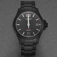 Black stainless steel case and bracelet. Fixed black stainless steel bezel. Black dial with black hands and index hour markers. Minute markers around the outer rim. Dial Type: Analog. Luminescent hands and markers. Date display at the 3 o'clock position. Longines Calibre L287.2 quartz movement. Scratch resistant sapphire crystal. Solid case back. Round case shape, case size: 43 mm. Fold over clasp with a safety release. Water resistant at 50 meters / 165 feet. Functions: date, hour, minute, second. Additional Info: original box, international warranty card, manual (complete accessories). Conquest Series. Luxury watch style. Watch label: Swiss Made. Longines Conquest Quartz Black Dial Men's Watch L3.728.2.66.6. CASE Case Size: 43 Case Material: Stainless Steel Case Shape: Round Case Back: Solid BAND Band Material: Stainless Steel Band Type: Bracelet Band Color: Black Clasp: Fold Over with Safety Release DIAL Dial Color: Black Type: Analog Crystal: Scratch Resistant Sapphire Hands: Black Dial Markers: Index Second Markers: Minute Markers around the outer rim Luminiscence: Hands and Markers Bezel: Fixed Bezel Color: Black Bezel Material: Stainless Steel INFORMATION Brand: Longines Series: Conquest Collection Name: Conquest Gender: Mens Model: L3.728.2.66.6 Watch Label: Swiss Made Movement: Quartz Engine: Longines Calibre L287.2 FEATURES Water Resistance: 50 meters / 165 feet Calendar: Date display at the 3 o'clock position Functions: Date, Hour, Minute, Second Watch Features: Stainless Steel, Analog ADDITIONAL INFO Watch Style: Luxury Warranty: 2 Year Jomashop Warranty Additional Info: Original Box, Manual (Complete Accessories) Jomashop Sku: LNG37282666 Department: Watches Category: Watches