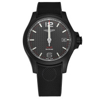 Black stainless steel case with a black rubber strap. Fixed black stainless steel bezel. Black dial with silver-tone hands and index hour markers. Minute markers around the outer rim. Dial Type: Analog. Luminescent hands and markers. Date display at the 3 o'clock position. Quartz movement. Scratch resistant sapphire crystal. Pull / push crown. Solid case back. Round case shape, case size: 43 mm, case thickness: 12.9 mm. Band width: 22 mm, band length: 8 inches. Deployment with push button release clasp. Water resistant at 50 meters / 165 feet. Functions: date, hour, minute, second. Conquest V.h.p. Series. Luxury watch style. Watch label: Swiss Made. Longines Conquest V.H.P. Black Dial Men's Watch L37282669. CASE Case Size: 43 Case Thickness: 12.9 mm Case Material: Stainless Steel Case Shape: Round Case Back: Solid BAND Band Material: Rubber Band Type: Strap Band Color: Black Band Length: 8 inches Band Width: 22 mm Clasp: Deployment with Push Button Release DIAL Dial Color: Black Type: Analog Crystal: Scratch Resistant Sapphire Hands: Silver-tone Dial Markers: Index Second Markers: Minute Markers around the outer rim Luminiscence: Hands and Markers Bezel: Fixed Bezel Color: Black Bezel Material: Stainless Steel Crown: Pull / Push INFORMATION Brand: Longines Series: Conquest V.H.P. Collection Name: Conquest V.H.P. Gender: Mens Model: L3.728.2.66.9 Watch Label: Swiss Made Movement: Quartz FEATURES Water Resistance: 50 meters / 165 feet Calendar: Date display at the 3 o'clock position Functions: Date, Hour, Minute, Second Watch Features: Stainless Steel, Rubber, Analog ADDITIONAL INFO Watch Style: Luxury Warranty: 2 Year Jomashop Warranty Jomashop Sku: LNG37282669 Department: Watches