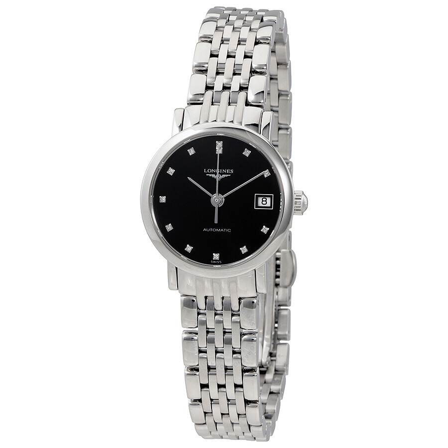 Stainless steel case with a stainless steel bracelet. Fixed stainless steel bezel. Black dial with silver-tone hands and diamond hour markers. Dial Type: Analog. Date display at the 3 o'clock position. Longines calibre L595/592 automatic movement, based upon ETA 2000-1, containing 20 Jewels, bitting at 28800 vph, and has a power reserve of approximately 40 hours. Scratch resistant sapphire crystal. Pull / push crown. Transparent case back. Round case shape. Case size: 25.5 mm. Case thickness: 8 mm. Band width: 13 mm. Fold over clasp with a push button release. Water resistant at 30 meters / 100 feet. Functions: date, hour, minute, second. Elegant Series. Luxury watch style. Watch label: Swiss Made. Longines Elegant Automatic Diamond Black Dial Ladies Watch L43094576. GENERAL Box Type: Original Box CASE Case Size: 25 Case Thickness: 8 mm Case Material: Stainless Steel Case Shape: Round Case Back: Transparent BAND Band Material: Stainless Steel Band Type: Bracelet Band Color: Silver-tone Band Width: 13 mm Clasp: Fold Over with Push Button Release DIAL Dial Color: Black Type: Analog Crystal: Scratch Resistant Sapphire Hands: Silver-tone Dial Markers: Diamond Bezel: Fixed Bezel Color: Silver-tone Bezel Material: Stainless Steel Crown: Pull / Push INFORMATION Brand: Longines Series: Elegant Collection Name: Elegant Gender: Womens Model: L43094576 Watch Label: Swiss Made Movement: Automatic Engine: Longines Calibre L595/592 Power Reserve: 40 hours FEATURES Water Resistance: 30 meters / 100 feet Calendar: Date display at the 3 o'clock position Functions: Date, Hour, Minute, Second Watch Features: Analog, Stainless Steel, Diamond ADDITIONAL INFO Watch Style: Luxury Warranty: 2 Year Jomashop Warranty UPC Code: 7612356182717 Jomashop Sku: LNG43094576 Department: Watches Category: Watches