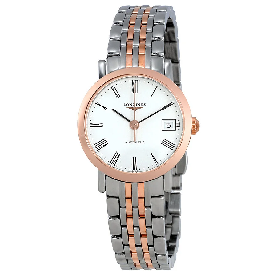 Silver-tone stainless steel case with a two-tone (silver-tone and rose gold PVD) stainless steel bracelet. Fixed rose gold PVD stainless steel bezel. White dial with black hands and Roman numeral hour markers. Minute markers around the outer rim. Dial Type: Analog. Date display at the 3 o'clock position. Longines Calibre L595/592 Automatic movement, based upon ETA 2000-1, containing 20 Jewels, bitting at 28800 vph, and has a power reserve of approximately 40 hours. Scratch resistant sapphire crystal. Pull / push crown. Transparent case back. Round case shape, case size: 25.5 mm, case thickness: 8 mm. Band width: 13 mm. Deployment clasp. Water resistant at 30 meters / 100 feet. Functions: date, hour, minute, second. Elegant Series. Luxury watch style. Watch label: Swiss Made. Longines Elegant Automatic White Dial Ladies Watch L43095117. GENERAL Box Type: Original Box CASE Case Diameter: 25.5 mm Case Thickness: 8 mm Case Material: Stainless Steel Case Shape: Round Case Back: Transparent BAND Band Material: Stainless Steel Band Type: Bracelet Band Color: Two-tone (Silver-tone and Rose Gold PVD) Band Width: 13 mm Clasp: Deployment DIAL Dial Color: White Type: Analog Crystal: Scratch Resistant Sapphire Hands: Black Dial Markers: Roman Numeral Second Markers: Minute Markers around the outer rim Bezel: Fixed Bezel Color: Rose Gold PVD Bezel Material: Stainless Steel Crown: Pull / Push INFORMATION Brand: Longines Series: Elegant Collection Name: Elegant Gender: Womens Model: L43095117 Watch Label: Swiss Made Movement: Automatic Engine: Longines Calibre L595/592 Power Reserve: 42 hours FEATURES Water Resistance: 30 meters / 100 feet Calendar: Date display at the 3 o'clock position Functions: Date, Hour, Minute, Second Watch Features: Analog, Gold, Stainless Steel ADDITIONAL INFO Watch Style: Luxury Warranty: 2 Year Jomashop Warranty UPC Code: 703200184340 Jomashop Sku: LNG43095117 Department: Watches Category: Watches