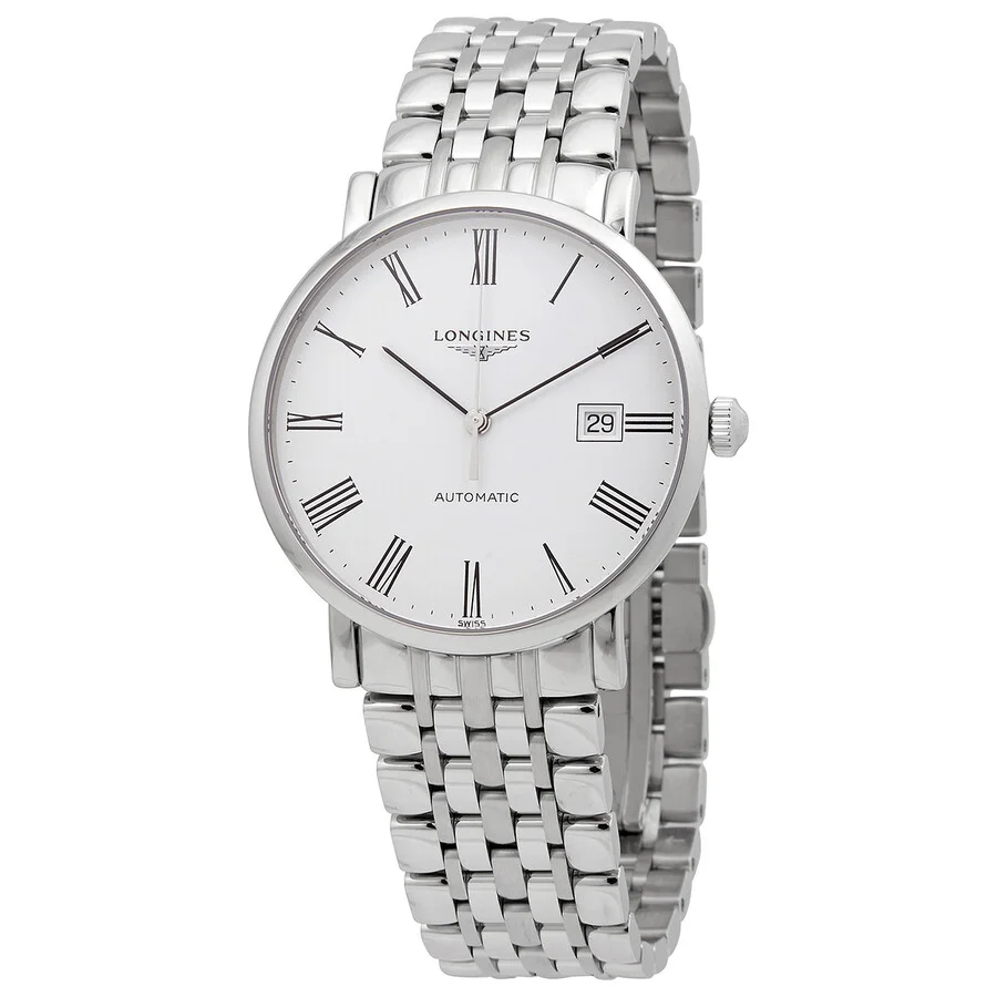 Stainless steel case with a stainless steel bracelet. Fixed stainless steel bezel. White dial with silver-tone hands and Roman numeral hour markers. Minute markers around the outer rim. Dial Type: Analog. Date display at the 3 o'clock position. Longines calibre L619/888 automatic movement with a 42-hour power reserve. Scratch resistant sapphire crystal. Pull / push crown. Transparent case back. Round case shape. Case size: 39 mm. Case thickness: 8.5 mm. Band width: 20 mm. Triple fold over clasp with a safety release. Water resistant at 30 meters / 100 feet. Functions: date, hour, minute, second. Luxury watch style. Watch label: Swiss Made. Longines Elegant Automatic White Dial Men's Watch L4.910.4.11.6. GENERAL Box Type: Original Box CASE Case Diameter: 39 mm Case Thickness: 8.5 mm Case Material: Stainless Steel Case Shape: Round Case Back: Transparent BAND Band Material: Stainless Steel Band Type: Bracelet Band Color: Silver-tone Band Width: 20 mm Clasp: Triple Fold Over with Safety Release DIAL Dial Color: White Type: Analog Crystal: Scratch Resistant Sapphire Hands: Silver-tone Dial Markers: Roman Numeral Second Markers: Minute Markers around the outer rim Bezel: Fixed Bezel Color: Silver-tone Bezel Material: Stainless Steel Crown: Pull / Push INFORMATION Brand: Longines Series: Elegant Collection Name: Elegant Gender: Mens Model: L4.910.4.11.6 Watch Label: Swiss Made Movement: Automatic Engine: Longines Calibre L619/888 Power Reserve: 42 hours FEATURES Water Resistance: 30 meters / 100 feet Calendar: Date display at the 3 o'clock position Functions: Date, Hour, Minute, Second Watch Features: Analog, Stainless Steel ADDITIONAL INFO Watch Style: Luxury Warranty: 2 Year Jomashop Warranty UPC Code: 703200188263 Jomashop Sku: LNG49104116 Department: Watches Category: Watches