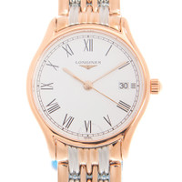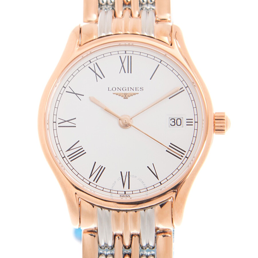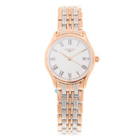 Rose gold-tone stainless steel case with a two-tone (silver-tone and rose gold-tone) stainless steel bracelet. Fixed rose gold-tone stainless steel bezel. White dial with rose gold-tone hands and Roman numeral hour markers. Minute markers around the outer rim. Dial Type: Analog. Date display at the 3 o'clock position. Quartz movement. Scratch resistant sapphire crystal. Solid case back. Round case shape, case size: 25 mm. Fold over clasp with a safety release. Functions: date, hour, minute, second. Additional Info: original box, manual (complete accessories). Elegant Series. Luxury watch style. Watch label: Swiss Made. Longines Elegant Quartz White Dial Ladies Watch L4.259.1.11.7. CASE Case Size: 25 Case Material: Stainless Steel Case Shape: Round Case Back: Solid BAND Band Material: Stainless Steel Band Type: Bracelet Band Color: Two-tone (Silver-tone and Rose Gold-tone) Clasp: Fold Over with Safety Release DIAL Dial Color: White Type: Analog Crystal: Scratch Resistant Sapphire Hands: Rose Gold-tone Dial Markers: Roman Numeral Second Markers: Minute Markers around the outer rim Bezel: Fixed Bezel Color: Rose Gold-tone Bezel Material: Stainless Steel INFORMATION Brand: Longines Series: Elegant Collection Name: Elegant Gender: Womens Model: L4.259.1.11.7 Watch Label: Swiss Made Movement: Quartz FEATURES Calendar: Date display at the 3 o'clock position Functions: Date, Hour, Minute, Second Watch Features: Stainless Steel, Gold, Analog ADDITIONAL INFO Watch Style: Luxury Warranty: 2 Year Jomashop Warranty Additional Info: Original Box, Manual (Complete Accessories) Jomashop Sku: LNG42591117 Department: Watches