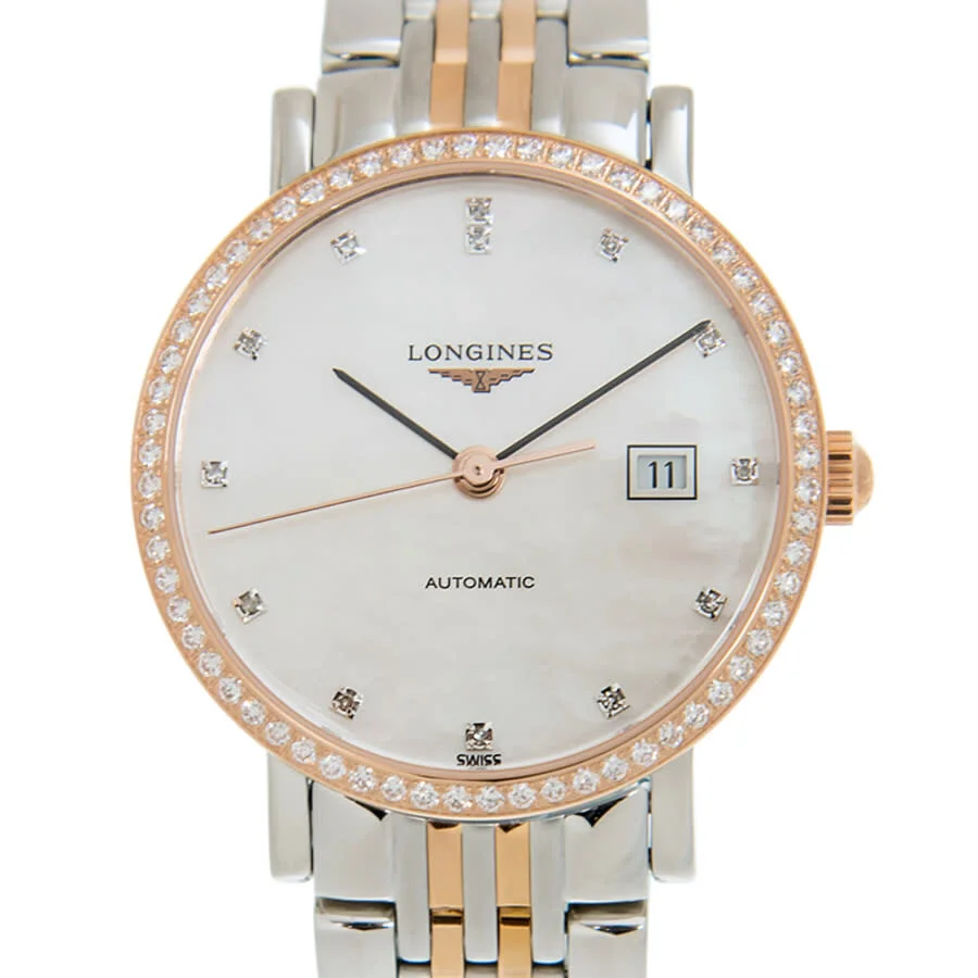 18kt rose gold case with a two-tone 18kt rose gold bracelet. Fixed bezel. White dial with n/a hour markers. Dial Type: Analog. Date display at the 3 o'clock position. Longines Calibre L595 Automatic movement, based upon ETA 2000/1, containing 20 Jewels, bitting at 28800 vph, and has a power reserve of approximately 40 hours. Scratch resistant sapphire crystal. Pull / push crown. Transparent case back. Round case shape, case size: 29 mm, case thickness: 9 mm. Band width: 14 mm. Hidden folding clasp. Water resistant at 30 meters / 100 feet. Functions: date, hour, minute, second. Elegant Series. Luxury watch style. Watch label: Swiss Made. Longines Elegant White Dial Ladies Watch L4.310.5.88.7. GENERAL Box Type: Original Box CASE Case Diameter: 29 mm Case Thickness: 9 mm Case Material: 18kt Rose Gold Case Shape: Round Case Back: Transparent BAND Band Material: 18kt Rose Gold Band Type: Bracelet Band Color: Two-tone Band Width: 14 mm Clasp: Hidden Folding Clasp DIAL Dial Color: White Type: Analog Crystal: Scratch Resistant Sapphire Bezel: Fixed Crown: Pull / Push INFORMATION Brand: Longines Series: Elegant Collection Name: Elegant Gender: Womens Model: L4.310.5.88.7 Watch Label: Swiss Made Movement: Automatic Engine: Longines Calibre L595 Power Reserve: 40 hours FEATURES Water Resistance: 30 meters / 100 feet Calendar: Date display at the 3 o'clock position Functions: Date, Hour, Minute, Second Watch Features: Analog, Gold ADDITIONAL INFO Watch Style: Luxury Warranty: 2 Year Jomashop Warranty UPC Code: 7612356188207 Jomashop Sku: LNG43105887 Department: Watches Category: Watches