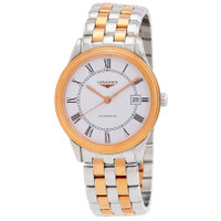 Two-tone (silver-tone and rose gold-tone) stainless steel case and bracelet. Fixed rose gold-tone stainless steel bezel. White dial with rose gold-tone hands and Roman numeral hour markers. Dial Type: Analog. Date display at the 3 o'clock position. Caliber L619 automatic movement with a 42-hour power reserve. Scratch resistant sapphire crystal. Pull / push crown. Transparent see through case back. Round case shape, case size: 38.5 mm, case thickness: 8 mm. Band width: 20 mm. Hidden clasp. Water resistant at 30 meters / 100 feet. Functions: date, hour, minute, second. Flagship Series. Dress watch style. Watch label: Swiss Made. Longines Flagship Automatic White Dial Men's Watch L48743917. GENERAL Box Type: Original Box CASE Case Size: 38 Case Thickness: 8 mm Case Material: Stainless Steel Case Shape: Round Case Back: Transparent See Through BAND Band Material: Stainless Steel Band Type: Bracelet Band Color: Two-tone (Silver-tone and Rose Gold-tone) Band Width: 20 mm Clasp: Hidden DIAL Dial Color: White Type: Analog Crystal: Scratch Resistant Sapphire Hands: Rose Gold-tone Dial Markers: Roman Numeral Bezel: Fixed Bezel Color: Rose Gold-tone Bezel Material: Stainless Steel Crown: Pull / Push INFORMATION Brand: Longines Series: Flagship Collection Name: Flagship Gender: Mens Model: L48743917 Watch Label: Swiss Made Movement: Automatic Engine: Caliber L619 Power Reserve: 42 hours FEATURES Water Resistance: 30 meters / 100 feet Calendar: Date display at the 3 o'clock position Functions: Date, Hour, Minute, Second Watch Features: Analog, Gold, Stainless Steel ADDITIONAL INFO Watch Style: Dress Warranty: 2 Year Jomashop Warranty Jomashop Sku: LNG48743917 Department: Watches Category: Watches