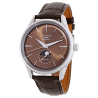 Silver-tone stainless steel case with a brown alligator band. Fixed silver-tone stainless steel bezel. Brown dial with silver-tone hands and index hour markers. Minute markers around the outer rim. Dial Type: Analog. One subdial displaying: date/moonphase. Longines Calibre L899 Automatic movement, based upon ETA A31.L91, containing 21 Jewels, bitting at 25200 vph, and has a power reserve of approximately 64 hours. Scratch resistant sapphire crystal. Solid case back. Round case shape, case size: 38 mm. Buckle clasp. Water resistant at 30 meters / 100 feet. Functions: moon phase, date, hour, minute, second. Flagship Heritage Moonphase Series. Luxury watch style. Watch label: Swiss Made. Longines Flagship Heritage Moonphase Automatic Moon Phase Brown Dial Men's Watch L4.815.4.62.2. GENERAL Box Type: Original Box CASE Case Diameter: 38 mm Case Material: Stainless Steel Case Shape: Round Case Back: Solid BAND Band Material: Alligator Band Type: Strap Band Color: Brown Clasp: Buckle DIAL Dial Color: Brown Type: Analog Crystal: Scratch Resistant Sapphire Hands: Silver-tone Dial Markers: Index Second Markers: Minute Markers around the outer rim Sub Dials: One - Date/Moonphase Bezel: Fixed Bezel Color: Silver-tone Bezel Material: Stainless Steel INFORMATION Brand: Longines Series: Flagship Heritage Moonphase Collection Name: Flagship Heritage Moonphase Gender: Mens Model: L4.815.4.62.2 Watch Label: Swiss Made Movement: Automatic Engine: Longines Calibre L899 Power Reserve: 72 hours FEATURES Water Resistance: 30 meters / 100 feet Functions: Moon Phase, Date, Hour, Minute, Second Watch Features: Alligator Leather, Analog, Stainless Steel, Moon Phase ADDITIONAL INFO Watch Style: Luxury Warranty: 2 Year Jomashop Warranty Jomashop Sku: LNG48154622 Department: Watches