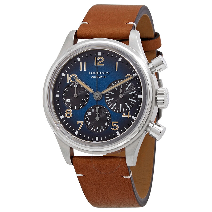 Grey titanium case with a brown (calfskin) leather strap. Fixed grey titanium bezel. Blue dial with luminous silver-tone hands and Arabic numeral hour markers. Minute markers around the outer rim. Luminescent hands and markers. Chronograph - three sub-dials displaying: 60 second, 1/10th of a second and 12 hours. Calibre L688 (ETA A08.L01) with silicon balance-spring automatic movement. Anti-reflective scratch resistant sapphire crystal. Pull / push crown. Solid case back. Round case shape. Case size: 41 mm. Case thickness: 14.50 mm. Band width: 22 mm. Tang clasp. Water resistant at 30 meters / 99 feet. Functions: chronograph, hour, minute, second. Heritage Series. Longines Heritage Chronograph Automatic Blue Dial Men's Watch L2.816.1.93.2. INFORMATION Brand: Longines Series: Heritage Collection Name: Heritage Gender: Mens Model: L2.816.1.93.2 Movement: Automatic Engine: Calibre L688 (ETA A08.L01) with silicon balance-spring CASE Case Size: 41 mm Case Thickness: 14.50 mm Case Material: Titanium Case Shape: Round Case Back: Solid BAND Band Material: (Calfskin) Leather Band Type: Strap Band Color: Brown Band Width: 22 mm Clasp: Tang DIAL Dial Color: Blue Crystal: Anti-Reflective Scratch Resistant Sapphire Hands: Luminous Silver-tone Dial Markers: Arabic Numeral Second Markers: Minute Markers around the outer rim Sub Dials: Three - 60 Second, 1/10th of a Second and 12 Hours Luminiscence: Hands and Markers Bezel: Fixed Bezel Color: Grey Bezel Material: Titanium Crown: Pull / Push FEATURES Water Resistance: 30 meters / 99 feet Functions: Chronograph, Hour, Minute, Second Watch Features: Chronograph, Titanium, Leather ADDITIONAL INFO Warranty: 2 Year Jomashop Warranty UPC Code: 7612356214104 Jomashop Sku: LNG28161932 Department: Watches Category: Watches