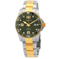 Stainless steel case with a stainless steel bracelet with 18kt yellow gold center links. Uni-directional rotating 18kt yellow gold bezel with an inlaid green ceramic ring. Green dial with luminous yellow gold-tone hands and dot hour markers. Arabic numerals appear at the 6, 9 and 12 o'clock positions. Minute markers around the outer rim. Dial Type: Analog. Luminescent hands and markers. Date display at the 3 o'clock position. Longines calibre L888 automatic movement, based upon ETA A31.L11, containing 21 Jewels, bitting at 25200 vph, and has a power reserve of approximately 64 hours. Scratch resistant sapphire crystal. Screw down crown. Solid case back. Round case shape. Case size: 41 mm. Case thickness: 11.9 mm. Band width: 21 mm. Fold over clasp. Water resistant at 300 meters / 1000 feet. Functions: date, hour, minute, second. Additional Info: original box, manual (complete accessories). Hydro Conquest Series. Luxury watch style. Watch label: Swiss Made. Longines Hydro Conquest Automatic Green Dial Men's Watch L3.781.3.06.7. INFORMATION Brand: Longines Series: Hydro Conquest Collection Name: Hydro Conquest Gender: Mens Model: L3.781.3.06.7 Watch Label: Swiss Made Movement: Automatic Engine: Longines Calibre L888 Power Reserve: 64 hours CASE Case Size: 41 mm Case Thickness: 11.9 mm Case Material: Stainless Steel Case Shape: Round Case Back: Solid BAND Band Material: Stainless Steel with 18kt Yellow Gold Center Links Band Type: Bracelet Band Color: Silver-tone Band Width: 21 mm Clasp: Fold Over DIAL Dial Color: Green Type: Analog Crystal: Scratch Resistant Sapphire Hands: Luminous Yellow Gold-tone Dial Markers: Dot Second Markers: Arabic Numerals appear at the 6, 9 and 12 o'clock positions. Minute Markers around the outer rim Luminiscence: Hands and Markers Bezel: Uni-directional Rotating Bezel Material: 18kt Yellow Gold with an inlaid Green Ceramic Ring Crown: Screw Down FEATURES Water Resistance: 300 meters / 1000 feet Calendar: Date display at the 3 o'clock position Functions: Date, Hour, Minute, Second Watch Features: Stainless Steel, Gold, Ceramic, Analog ADDITIONAL INFO Watch Style: Luxury Warranty: 2 Year Jomashop Warranty UPC Code: 7612356219376 Additional Info: Original Box, Manual (Complete Accessories) Jomashop Sku: LNG37813067 Department: Watches Category: Watches