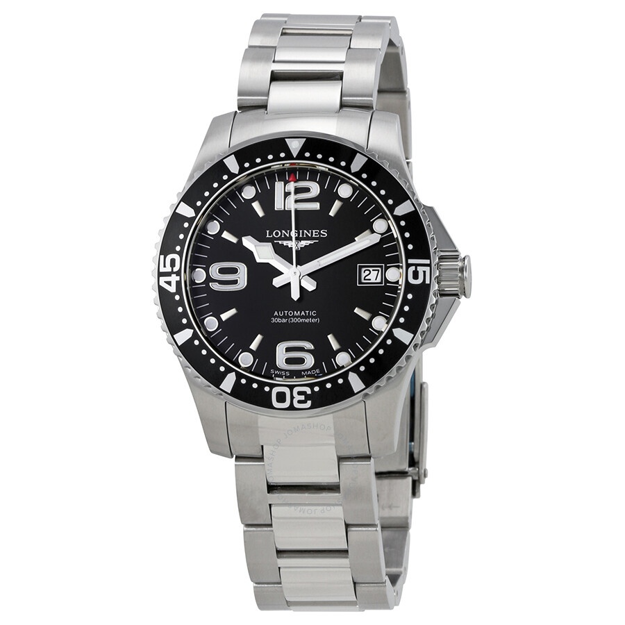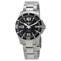 Silver-tone stainless steel case and bracelet. Uni-directional rotating stainless steel bezel with a black top ring. Black dial with luminous silver-tone snowflake-shape hands and index hour markers. Arabic numerals mark the 6, 9 and 12 o'clock positions. Minute markers around the outer rim. Dial Type: Analog. Luminescent hands and markers. Date display at the 3 o'clock position. Longines Calibre L888 Automatic movement, based upon ETA A31.L11, containing 21 Jewels, bitting at 25200 vph, and has a power reserve of approximately 72 hours. Scratch resistant sapphire crystal. Screw down crown. Solid case back. Round case shape, case size: 39 mm, case thickness: 11.85 mm. Band width: 20 mm. Fold over clasp. Water resistant at 300 meters / 1000 feet. Functions: date, hour, minute, second. Hydroconquest Series. Dive watch style. Watch label: Swiss Made. Longines HydroConquest Automatic Black Dial Men's 39 mm Watch L3.741.4.56.6. INFORMATION Brand: Longines Series: Hydroconquest Collection Name: HydroConquest Gender: Mens Model: L3.741.4.56.6 Watch Label: Swiss Made Movement: Automatic Engine: Longines Calibre L888 Power Reserve: 72 hours CASE Case Size: 39 mm Case Thickness: 11.85 mm Case Material: Stainless Steel Case Shape: Round Case Back: Solid BAND Band Material: Stainless Steel Band Type: Bracelet Band Color: Silver-tone Band Width: 20 mm Clasp: Fold Over DIAL Dial Color: Black Type: Analog Crystal: Scratch Resistant Sapphire Hands: Luminous Silver-tone Snowflake-shape Dial Markers: Index Second Markers: Arabic Numerals mark the 6, 9 and 12 o'clock positions. Minute Markers around the outer rim Luminiscence: Hands and Markers Bezel: Uni-directional Rotating Bezel Color: Black Top Ring Bezel Material: Stainless Steel Crown: Screw Down FEATURES Water Resistance: 300 meters / 1000 feet Calendar: Date display at the 3 o'clock position Functions: Date, Hour, Minute, Second Watch Features: Stainless Steel, Analog ADDITIONAL INFO Watch Style: Dive Warranty: 2 Year Jomashop Warranty UPC Code: 703200198453 Jomashop Sku: LNG37414566 Department: Watches Category: Watches
