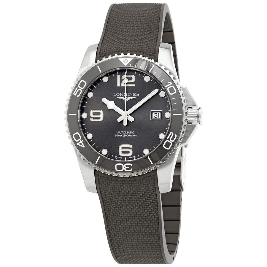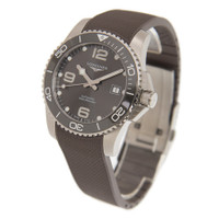 Stainless steel case with a grey rubber strap. Uni-directional rotating stainless steel bezel with a grey ceramic ringl. Grey dial with luminous silver-tone snowflake-shape hands and dot hour markers. Arabic numerals mark the 6, 9 and 12 o'clock positions. Minute markers around the outer rim. Dial Type: Analog. Luminescent hands and markers. Date display at the 3 o'clock position. Longines calibre L619/888 automatic movement, based upon ETA 2892, containing 21 Jewels, bitting at 25200 vph, and has a power reserve of approximately 64 hours. Scratch resistant sapphire crystal. Screw down crown. Solid case back. Round case shape. Case size: 41 mm. Band width: 21 mm. Fold over clasp. Water resistant at 300 meters / 1000 feet. Functions: date, hour, minute, second. Hydroconquest Series. Dive watch style. Watch label: Swiss Made. Longines Hydroconquest Automatic Grey Dial Men's Watch L3.781.4.76.9. INFORMATION Brand: Longines Series: Hydroconquest Collection Name: Hydroconquest Gender: Mens Model: L3.781.4.76.9 Watch Label: Swiss Made Movement: Automatic Engine: Longines Calibre L619/888 Power Reserve: 64 hours CASE Case Size: 41 mm Case Material: Stainless Steel Case Shape: Round Case Back: Solid BAND Band Material: Rubber Band Type: Strap Band Color: Grey Band Width: 21 mm Clasp: Fold Over DIAL Dial Color: Grey Type: Analog Crystal: Scratch Resistant Sapphire Hands: Luminous Silver-tone Snowflake-shape Dial Markers: Dot Second Markers: Arabic Numerals mark the 6, 9 and 12 o'clock positions. Minute Markers around the outer rim Luminiscence: Hands and Markers Bezel: Uni-directional Rotating Bezel Color: Silver-tone Bezel Material: Stainless Steel with a Grey Ceramic Ring Crown: Screw Down FEATURES Water Resistance: 300 meters / 1000 feet Calendar: Date display at the 3 o'clock position Functions: Date, Hour, Minute, Second Watch Features: Stainless Steel, Rubber, Ceramic, Analog ADDITIONAL INFO Watch Style: Dive Warranty: 2 Year Jomashop Warranty UPC Code: 7612356206413 Jomashop Sku: LNG37814769 Department: Watches Category: Watches