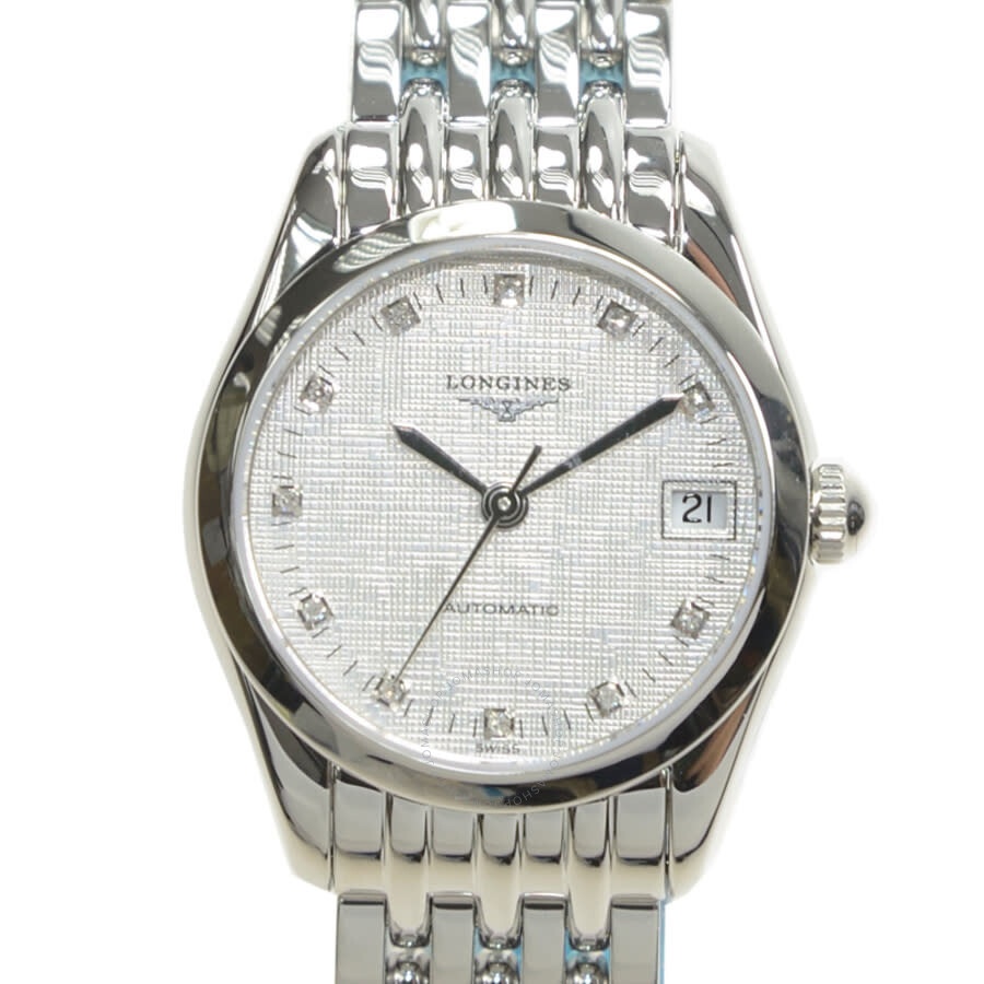 Silver-tone stainless steel case and bracelet. Fixed silver-tone stainless steel bezel. Silver-tone dial with silver-tone hands and diamond hour markers. Minute markers around the outer rim. Dial Type: Analog. Date display at the 3 o'clock position. Longines Calibre L595 Automatic movement, based upon ETA 2000/1, containing 20 Jewels, bitting at 28800 vph, and has a power reserve of approximately 40 hours. Scratch resistant sapphire crystal. Transparent see through case back. Round case shape, case size: 25 mm. Fold over clasp with a safety release. Functions: date, hour, minute, second. La Grande Series. Luxury watch style. Watch label: Swiss Made. Longines La Grande Automatic Diamond Silver Dial Ladies Watch L4.398.4.77.6. CASE Case Size: 25 Case Material: Stainless Steel Case Shape: Round Case Back: Transparent See Through BAND Band Material: Stainless Steel Band Type: Bracelet Band Color: Silver-tone Clasp: Fold Over with Safety Release DIAL Dial Color: Silver-tone Type: Analog Crystal: Scratch Resistant Sapphire Hands: Silver-tone Dial Markers: Diamond Second Markers: Minute Markers around the outer rim Bezel: Fixed Bezel Color: Silver-tone Bezel Material: Stainless Steel INFORMATION Brand: Longines Series: La Grande Collection Name: La Grande Gender: Womens Model: L4.398.4.77.6 Watch Label: Swiss Made Movement: Automatic Engine: Longines Calibre L595 Power Reserve: 40 hours FEATURES Calendar: Date display at the 3 o'clock position Functions: Date, Hour, Minute, Second Watch Features: Diamond, Stainless Steel, Analog ADDITIONAL INFO Watch Style: Luxury Warranty: 2 Year Jomashop Warranty Jomashop Sku: LNG43984776 Department: Watches