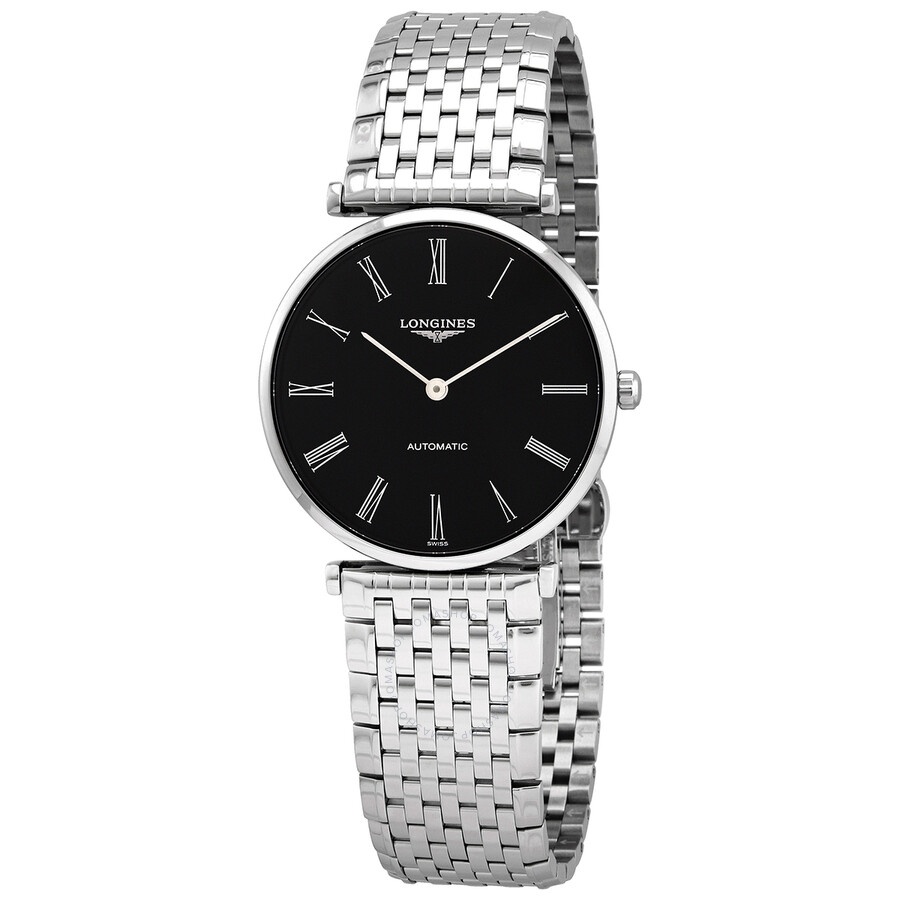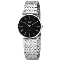 Stainless steel case with a stainless steel bracelet. Fixed stainless steel bezel. Sunray black dial with silver-tone hands and Roman numeral hour markers. Dial Type: Analog. Longines calibre L591 automatic movement, based upon ETA A20.L01, containing 22 Jewels, bitting at 28800 vph, and has a power reserve of approximately 40 hours. Scratch resistant sapphire crystal. Pull / push crown. Solid case back. Round case shape. Case size: 36 mm. Fold over clasp with a push button release. Water resistant at 30 meters / 100 feet. Functions: hour, minute. La Grande Classique Series. Dress watch style. Watch label: Swiss Made. Longines La Grande Classique Automatic Men's Watch L49084516. INFORMATION Brand: Longines Series: La Grande Classique Collection Name: La Grande Classique Gender: Mens Model: L49084516 Watch Label: Swiss Made Movement: Automatic Engine: Longines Calibre L591 Power Reserve: 40 hours CASE Case Size: 36 mm Case Material: Stainless Steel Case Shape: Round Case Back: Solid BAND Band Material: Stainless Steel Band Type: Bracelet Band Color: Silver-tone Clasp: Fold Over with Push Button Release DIAL Dial Color: Sunray Black Type: Analog Crystal: Scratch Resistant Sapphire Hands: Silver-tone Dial Markers: Roman Numeral Bezel: Fixed Bezel Color: Silver-tone Bezel Material: Stainless Steel Crown: Pull / Push FEATURES Water Resistance: 30 meters / 100 feet Functions: Hour, Minute Watch Features: Stainless Steel, Analog ADDITIONAL INFO Watch Style: Dress Warranty: 2 Year Jomashop Warranty UPC Code: 7612356212414 Jomashop Sku: LNG49084516 Department: Watches Category: Watches