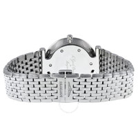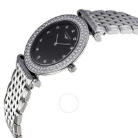 Stainless steel case with a stainless steel bracelet. Fixed silver-tone bezel set with diamonds. Black dial with silver-tone hands and diamond hour markers. Dial Type: Analog. Quartz movement. Scratch resistant sapphire crystal. Pull / push crown. Solid case back. Case diameter: 29 mm. Case thickness: 4.6 mm. Round case shape. Band width: 16 mm. Triple folding safety clasp. Water resistant at 30 meters / 100 feet. Functions: hour, minute. Dress watch style. Longines La Grande Classique Black Dial Stainless Steel Ladies Watch L43080576. INFORMATION Brand: Longines Series: La Grande Classique Collection Name: La Grande Classique Gender: Womens Model: L4.308.0.57.6 Watch Label: Swiss Movement: Quartz Engine: Longines Calibre L209 CASE Case Size: 29 mm Case Thickness: 4.6 mm Case Material: Stainless Steel Case Shape: Round Case Back: Solid BAND Band Material: Stainless Steel Band Type: Bracelet Band Color: Silver-tone Band Width: 16 mm Clasp: Triple Fold Over Safety DIAL Dial Color: Black Type: Analog Crystal: Scratch Resistant Sapphire Hands: Silver-tone Dial Markers: Diamond Bezel: Fixed Bezel Color: Silver-tone Bezel Material: Diamond Set Crown: Pull / Push FEATURES Water Resistance: 30 meters / 100 feet Functions: Hour, Minute Watch Features: Diamond, Stainless Steel, Analog ADDITIONAL INFO Watch Style: Dress Warranty: 2 Year Jomashop Warranty UPC Code: 703200076034 Jomashop Sku: LNG43080576 Item Variation: L4 308 0 57 6, L4-308-0-57-6, L4/308/0/57/6, L43080576 Department: Watches Category: Watches