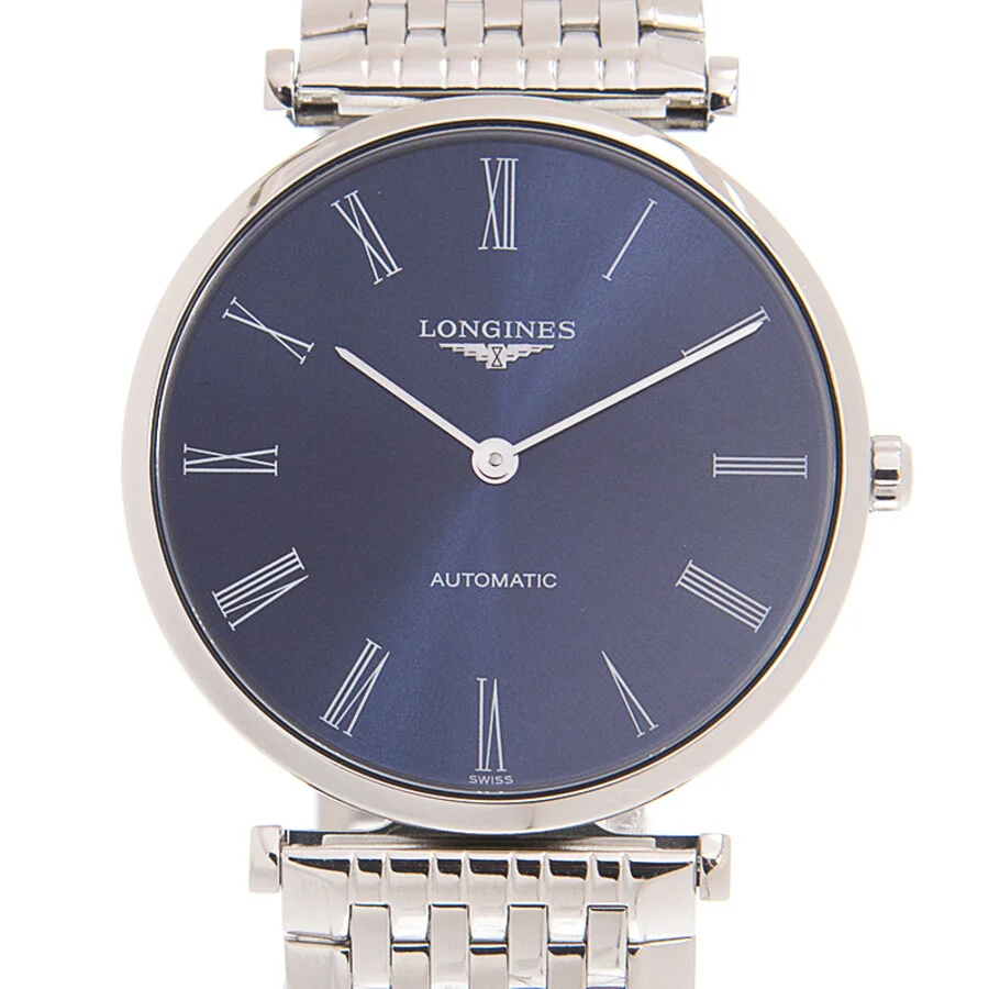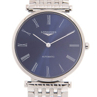 Stainless steel case with a stainless steel bracelet. Fixed stainless steel bezel. Blue dial with silver-tone hands and Roman numeral hour markers. Dial Type: Analog. Longines calibre L591 automatic movement, based upon ETA A20.L01, containing 22 Jewels, bitting at 28800 vph, and has a power reserve of approximately 40 hours. Scratch resistant sapphire crystal. Pull / push crown. Transparent case back. Round case shape. Case size: 36 mm. Case thickness: 7.6 mm. Band width: 20 mm. Fold over clasp with a push button release. Water resistant at 30 meters / 100 feet. Functions: hour, minute. Additional Info: original box, manual (complete accessories). La Grande Classique Series. Luxury watch style. Watch label: Swiss Made. Longines La Grande Classique Blue Dial Ladies Watch L4.908.4.94.6. GENERAL Box Type: Original Box CASE Case Diameter: 36 mm Case Thickness: 7.6 mm Case Material: Stainless Steel Case Shape: Round Case Back: Transparent BAND Band Material: Stainless Steel Band Type: Bracelet Band Color: Silver-tone Band Width: 20 mm Clasp: Fold Over with Push Button Release DIAL Dial Color: Blue Type: Analog Crystal: Scratch Resistant Sapphire Hands: Silver-tone Dial Markers: Roman Numeral Bezel: Fixed Bezel Color: Silver-tone Bezel Material: Stainless Steel Crown: Pull / Push INFORMATION Brand: Longines Series: La Grande Classique Collection Name: La Grande Classique Gender: Womens Model: L4.908.4.94.6 Watch Label: Swiss Made Movement: Automatic Engine: Longines Calibre L591 Power Reserve: 40 hours FEATURES Water Resistance: 30 meters / 100 feet Functions: Hour, Minute Watch Features: Analog, Stainless Steel ADDITIONAL INFO Watch Style: Luxury Warranty: 2 Year Jomashop Warranty UPC Code: 7612356193003 Additional Info: Original Box, Manual (Complete Accessories) Jomashop Sku: LNG49084946 Department: Watches Category: Watches