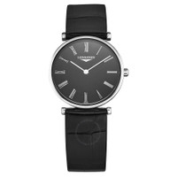 Stainless steel case with a black (alligator) leather strap. Fixed stainless steel bezel. Black dial with silver-tone hands and Roman numeral hour markers. Dial Type: Analog. Longines caliber L420 quartz movement. Scratch resistant sapphire crystal. Pull / push crown. Solid case back. Round case shape. Case size: 29 mm. Case thickness: 5 mm. Band width: 16 mm. Tang clasp. Water resistant at 30 meters / 99 feet. Functions: hour, minute. La Grande Classique Series. Dress watch style. Watch label: Swiss Made. Longines La Grande Classique Quartz Black Dial Ladies Watch L4.512.4.51.2. GENERAL Box Type: Original Box CASE Case Size: 29 Case Thickness: 5 mm Case Material: Stainless Steel Case Shape: Round Case Back: Solid BAND Band Material: (Alligator) Leather Band Type: Strap Band Color: Black Band Width: 16 mm Clasp: Tang DIAL Dial Color: Black Type: Analog Crystal: Scratch Resistant Sapphire Hands: Silver-tone Dial Markers: Roman Numeral Bezel: Fixed Bezel Color: Silver-tone Bezel Material: Stainless Steel Crown: Pull / Push INFORMATION Brand: Longines Series: La Grande Classique Collection Name: La Grande Classique Gender: Womens Model: L4.512.4.51.2 Watch Label: Swiss Made Movement: Quartz Engine: Longines caliber L420 FEATURES Water Resistance: 30 meters / 99 feet Functions: Hour, Minute Watch Features: Alligator Leather, Analog, Leather, Stainless Steel ADDITIONAL INFO Watch Style: Dress Warranty: 2 Year Jomashop Warranty Jomashop Sku: LNG45124512 Department: Watches Category: Watches