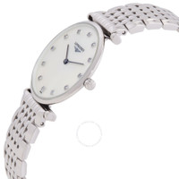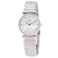 Silver-tone stainless steel case and bracelet. Fixed silver-tone stainless steel bezel. White mother of pearl dial with black hands and 12 top wesselton VS-SI diamond hour markers, for a total of 0.081 carats. Dial Type: Analog. Longines Calibre L420 quartz movement. Scratch resistant sapphire crystal. Pull / push crown. Solid case back. Round case shape, case size: 29 mm, case thickness: 4.5 mm. Band width: 16 mm. Fold over clasp with a safety release. Water resistant at 30 meters / 100 feet. Functions: hour, minute. La Grande Classique Series. Casual watch style. Watch label: Swiss Made. Longines La Grande Classique Quartz Diamond White Mother of Pearl Dial Ladies Watch L4.512.4.87.C. GENERAL Box Type: Original Box CASE Case Diameter: 29 mm Case Thickness: 4.5 mm Case Material: Stainless Steel Case Shape: Round Case Back: Solid BAND Band Material: Stainless Steel Band Type: Bracelet Band Color: Silver-tone Band Width: 16 mm Clasp: Fold Over with Safety Release DIAL Dial Color: White Mother of Pearl Type: Analog Crystal: Scratch Resistant Sapphire Hands: Black Dial Markers: Diamond Bezel: Fixed Bezel Color: Silver-tone Bezel Material: Stainless Steel Crown: Pull / Push INFORMATION Brand: Longines Series: La Grande Classique Collection Name: La Grande Classique Gender: Womens Model: L4.512.4.87.C Watch Label: Swiss Made Movement: Quartz Engine: Longines Calibre L420 FEATURES Water Resistance: 30 meters / 100 feet Functions: Hour, Minute Watch Features: Analog, Stainless Steel, Diamond ADDITIONAL INFO Watch Style: Casual Warranty: 2 Year Jomashop Warranty Jomashop Sku: LNGL4512487C Department: Watches
