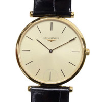 Yellow gold-tone stainless steel case with a black leather strap. Fixed yellow gold-tone stainless steel bezel. Gold-tone dial with black hands and index hour markers. Dial Type: Analog. Longines Calibre L420 quartz movement. Scratch resistant sapphire crystal. Solid case back. Round case shape, case size: 33 mm, case thickness: 5 mm. Band width: 18 mm. Buckle clasp. Water resistant at 30 meters / 100 feet. Functions: hour, minute. Additional Info: original box, international warranty card, manual (complete accessories). La Grande Classique Series. Luxury watch style. Watch label: Swiss Made. Item Variations: L4 709 2 32 2, L4-709-2-32-2, L4/709/2/32/2, L47092322. Longines La Grande Classique Quartz Gold Dial Ladies Watch L4.709.2.32.2. CASE Case Size: 33 Case Thickness: 5 mm Case Material: Stainless Steel Case Shape: Round Case Back: Solid BAND Band Material: Leather Band Type: Strap Band Color: Black Band Width: 18 mm Clasp: Buckle DIAL Dial Color: Gold-tone Type: Analog Crystal: Scratch Resistant Sapphire Hands: Black Dial Markers: Index Bezel: Fixed Bezel Color: Yellow Gold-tone Bezel Material: Stainless Steel INFORMATION Brand: Longines Series: La Grande Classique Collection Name: La Grande Classique Gender: Womens Model: L4.709.2.32.2 Watch Label: Swiss Made Movement: Quartz Engine: Longines Calibre L420 FEATURES Water Resistance: 30 meters / 100 feet Functions: Hour, Minute Watch Features: Analog, Gold, Leather, Stainless Steel ADDITIONAL INFO Watch Style: Luxury Warranty: 2 Year Jomashop Warranty Additional Info: Original Box, Manual (Complete Accessories) Jomashop Sku: LNG47092322 Item Variation: L4 709 2 32 2, L4-709-2-32-2, L4/709/2/32/2, L47092322 Department: Watches