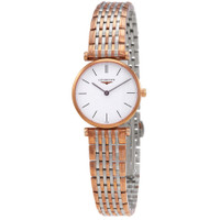Rose gold PVD stainless steel case with a two-tone (silver-tone and rose gold PVD) stainless steel bracelet. Fixed rose gold PVD bezel. White dial with black hands and index hour markers. Dial Type: Analog. Quartz movement. Scratch resistant mineral crystal. Pull / push crown. Solid case back. Round case shape. Case size: 24 mm. Water resistant at 30 meters / 100 feet. Functions: hour, minute. La Grande Classique Series. Casual watch style. Watch label: Swiss Made. Longines La Grande Classique Quartz White Dial Ladies Watch L42091927. GENERAL Box Type: Original Box CASE Case Size: 24 Case Material: Stainless Steel Case Shape: Round Case Back: Solid BAND Band Material: Stainless Steel Band Type: Bracelet Band Color: Two-tone (Silver-tone and Rose Gold PVD) Clasp: Fold Over with Push Button Release DIAL Dial Color: White Type: Analog Crystal: Scratch Resistant Mineral Hands: Black Dial Markers: Index Bezel: Fixed Bezel Material: Rose Gold PVD Crown: Pull / Push INFORMATION Brand: Longines Series: La Grande Classique Collection Name: La Grande Classique Gender: Womens Model: L42091927 Watch Label: Swiss Made Movement: Quartz FEATURES Water Resistance: 30 meters / 100 feet Functions: Hour, Minute Watch Features: Analog, Gold, Stainless Steel ADDITIONAL INFO Watch Style: Casual Warranty: 2 Year Jomashop Warranty UPC Code: 7612356196660 Jomashop Sku: LNG42091927 Department: Watches Category: Watches