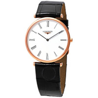 Rose gold PVD stainless steel case with a black alligator leather strap. Fixed rose gold-tone stainless steel bezel. White dial with rose gold-tone hands and Roman numeral hour markers. Dial Type: Analog. Longines Calibre L420 quartz movement. Scratch resistant sapphire crystal. Pull / push crown. Solid case back. Round case shape. Case size: 33 mm. Buckle clasp. Water resistant at 30 meters / 100 feet. Functions: hour, minute. Dress watch style. Watch label: Swiss Made. Item Variations: L47091212. Longines La Grande Classique White Dial Ladies Leather Watch L4.709.1.21.2. INFORMATION Brand: Longines Series: La Grande Classique Collection Name: La Grande Classique Gender: Womens Model: L4.709.1.21.2 Watch Label: Swiss Made Movement: Quartz Engine: Longines Calibre L420 CASE Case Size: 33 mm Case Material: Stainless Steel Case Shape: Round Case Back: Solid BAND Band Material: Alligator Leather Band Type: Strap Band Color: Black Clasp: Buckle DIAL Dial Color: White Type: Analog Crystal: Scratch Resistant Sapphire Hands: Rose Gold-tone Dial Markers: Roman Numeral Bezel: Fixed Bezel Color: Rose Gold-tone Bezel Material: Stainless Steel Crown: Pull / Push FEATURES Water Resistance: 30 meters / 100 feet Functions: Hour, Minute Watch Features: Stainless Steel, Leather, Gold, Analog, Alligator Leather ADDITIONAL INFO Watch Style: Dress Warranty: 2 Year Jomashop Warranty UPC Code: 842047176856 Jomashop Sku: LNG47091212 Item Variation: L47091212 Department: Watches Category: Watches