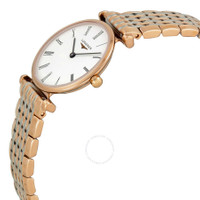 Rose gold PVD stainless steel case with a two-tone (silver and rose gold PVD) stainless steel bracelet. Fixed rose gold PVD bezel. White dial with black hands and Roman numeral hour markers. Dial Type: Analog. Longines calibre L209 quartz movement. Scratch resistant sapphire crystal. Pull / push crown. Solid case back. Case size: 24 mm. Case thickness: 5 mm. Round case shape. Deployment clasp. Water resistant at 30 meters / 100 feet. Functions: hour, minute. Dress watch style. Watch label: Swiss. Item Variations: L4 209 1 91 7, L4-209-1-91-7, L4/209/1/91/7, L42091917. Longines La Grande Classique White Dial Two-tone Ladies Watch L42091917. INFORMATION Brand: Longines Series: La Grande Classique Collection Name: La Grande Classique Gender: Womens Model: L4.209.1.91.7 Watch Label: Swiss Movement: Quartz Engine: Longines Calibre L209 CASE Case Size: 24 mm Case Thickness: 5 mm Case Material: Stainless Steel Case Shape: Round Case Back: Solid BAND Band Material: Stainless Steel Band Type: Bracelet Band Color: Two-tone (Silver-tone and Rose Gold PVD) Clasp: Deployment DIAL Dial Color: White Type: Analog Crystal: Scratch Resistant Sapphire Hands: Black Dial Markers: Roman Numeral Bezel: Fixed Bezel Color: Rose Gold PVD Bezel Material: Stainless Steel Crown: Pull / Push FEATURES Water Resistance: 30 meters / 100 feet Functions: Hour, Minute Watch Features: Stainless Steel, Gold, Analog ADDITIONAL INFO Watch Style: Dress Warranty: 2 Year Jomashop Warranty UPC Code: 845960060776 Jomashop Sku: LNG42091917 Item Variation: L4 209 1 91 7, L4-209-1-91-7, L4/209/1/91/7, L42091917 Department: Watches Category: Watches